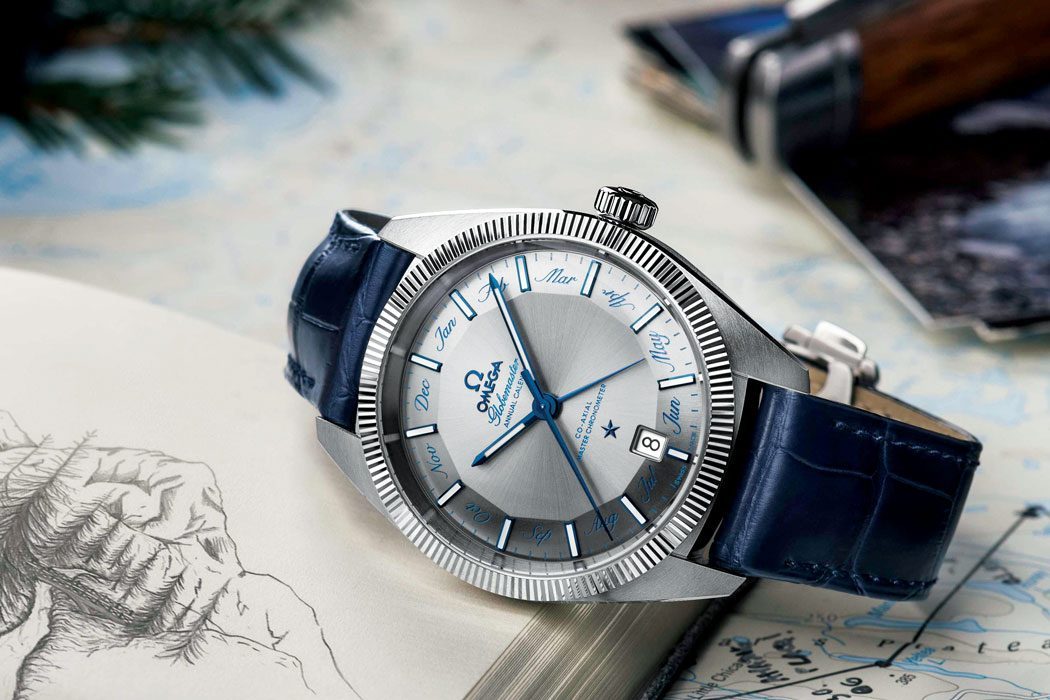 其他呈現藍色光澤的還有拋光中央秒針、歐米茄品牌標識、星座系列的星星標誌以及錶盤上的刻字。同時,腕錶也選用藍色皮錶帶搭配不銹鋼搭扣,來契合整體的藍色主題。