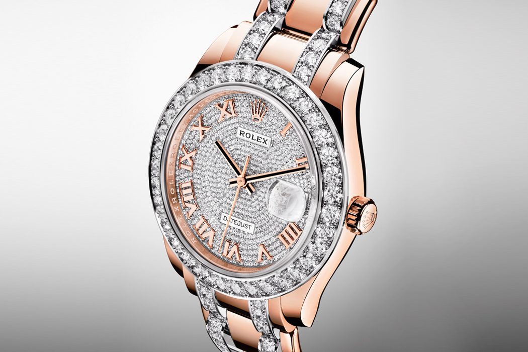 Pearlmaster 錶帶以實心 18 ct 金鏈節製成,線條優美,使腕錶別具魅力,亦令人佩戴舒適。錶帶裝配有隱蔽式皇冠帶扣,既優雅,且實用。而另外一款錶帶,其 18 ct 白色黃金中間鏈節鑲有頂級美鑽,手工精美,與外圈及錶面的鑽石互相輝映,高超的寶石鑲嵌工藝為這製錶傑作添上點睛之筆。