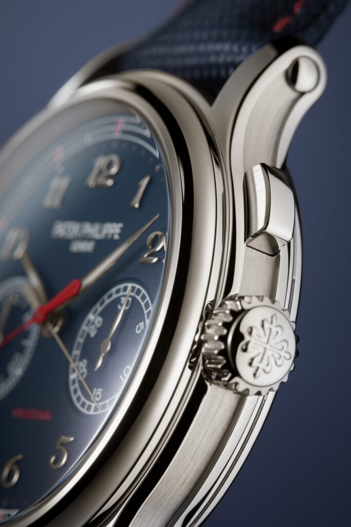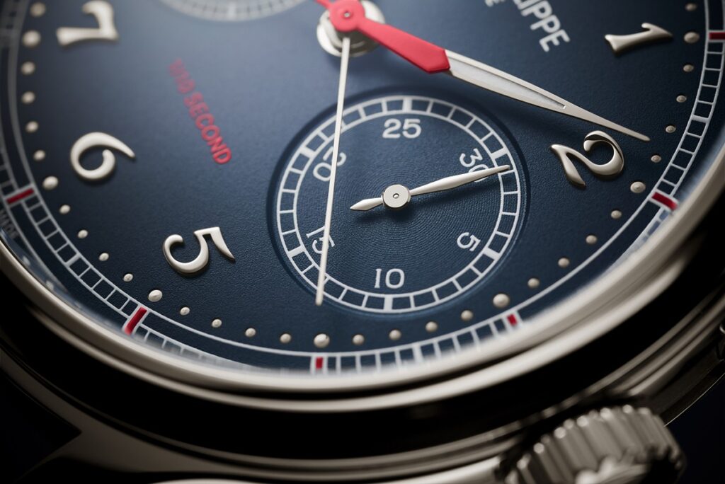為了清楚展示十分之一秒計時,百達翡麗特別運用專利同心圓顯示,設置兩組計時裝置,一組負責傳統計秒以及30分累計測量,另一組則用來展示十分之一秒的測量結果。因此錶盤最外圍的刻度數一共有12等分,每等分代表一秒鐘走時,每等分又分成10個等分,代表十分之一秒。啟動計時功能後,紅色的指針便會按照這個刻度進行走時。