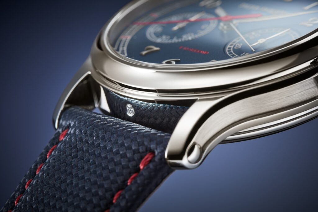 乍一看,Ref. 5470P-001腕錶的外觀相對於百達翡麗珍稀工藝、複雜計時等系列而言並不算華麗。沒有過多點綴的藍色清漆錶盤,搭配飾有壓花紋理圖案的海軍藍小牛皮錶帶,其紅色裝飾縫線則與表盤配色諧美呼應。但另一方面,它光澤熠熠的鉑金錶殼和白金立體的錶盤數字等細節,以及考究的整體設計感,無一不凸顯出這款腕錶的名門之風。
