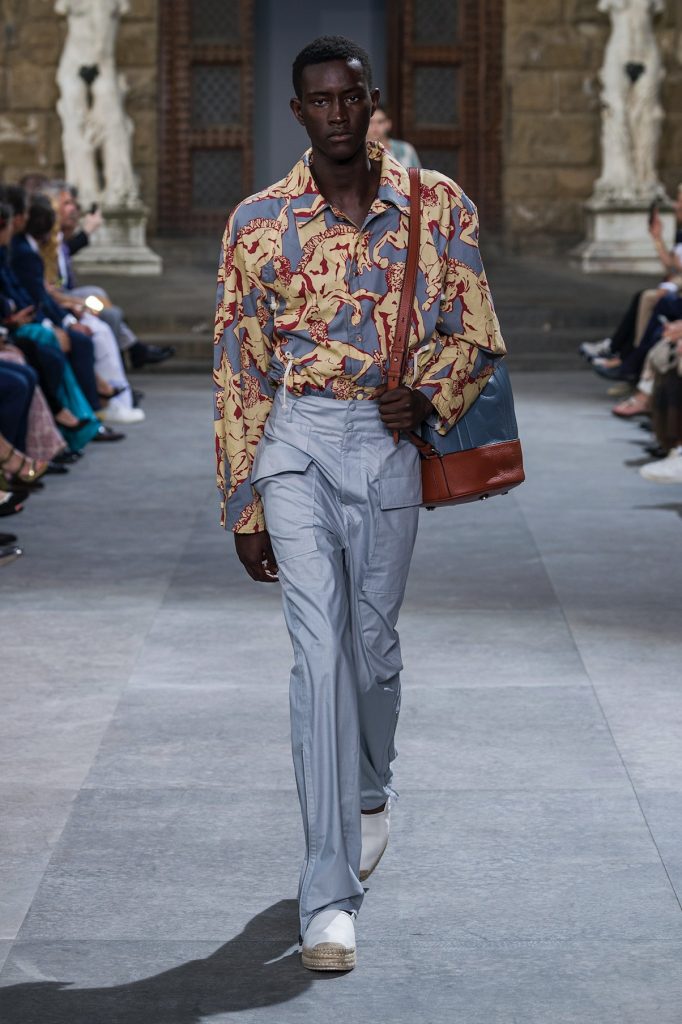 雖然Pitti Uomo的重心並不在時裝秀,但它在男裝界的優異口碑總能吸引知名設計師前來辦秀,曾經的客座設計師就包括Raf Simons、Jonathan Anderson、中村世紀等等。今年六月舉辦的第96屆Pitti Uomo中,客座設計師Paul Andrew帶來了他成為菲拉格慕(Salvatore Ferragamo)創意總監之後的第一場男裝秀。這位來自英國的設計師在菲拉格慕的誕生地重新與人們探討了奢侈的意義。在這個多數奢侈品牌都熱衷於設計針對千禧一代和Z世代的高街潮流的時代,Andrew似乎厭倦了男性時裝千篇一律的帽衫、運動褲和滿是品牌標誌的T恤,他說:「我真的不認為你可以把這些稱為奢侈。」於是,他決定將歷史、品牌基因和極致工藝結合。Napa皮質T恤、經典款Tramezza鞋履換上了球鞋的橡膠底、厚底Espadrilles草底鞋與摩登麂皮結合⋯⋯整場秀幾乎見不到品牌標誌的影子,但Andrew似乎就是有能力讓簡單的設計在細節之中盡顯高級質感,讓人一眼就能看出來自奢侈品牌。