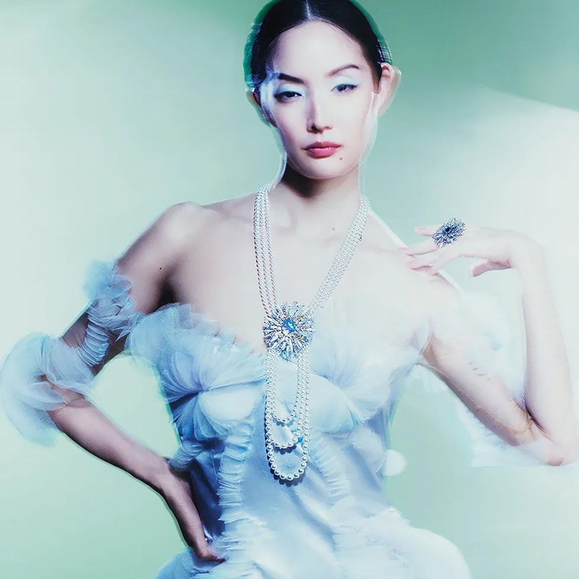 魚群項鏈是本系列中的亮點之一。經過數百小時的精心製作,旨在栩栩如生地呈現優雅游動的魚群於深海中的景象。此項鏈運用品牌獨有的珍珠編織工藝,以淡水珍珠和11種不同色彩的寶石交織而成,形成類似波浪的獨特形狀。這件作品以大海為畫布,將紫水晶、尖晶石、坦桑石、石榴石等彩色寶石排列成流暢曲線。順著海流暢遊的小魚們朝海中旋渦進發,一邊享受著大自然的懷抱,一邊聚集在光芒燦爛的珍珠泡沫中。