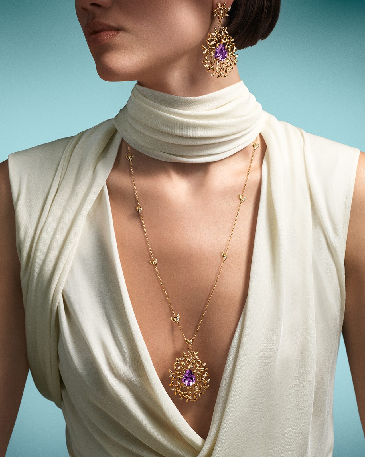 為了達到和諧的視覺效果,每片橄欖葉都被細膩地塑造成圓拱形,從上到下都帶有彎曲的弧度 ,像是一枚黃金戒指 ,葉片優雅地纏繞在指間,彷彿重現了古希臘羅馬時代皇室和奧運選手頭上戴的橄欖花環 。這次升級,加入更大膽的黃金比例以及限量的紫水晶特別設計,紫水晶以手工切割成水滴形與橢圓形,被葉片與枝蔓柔和包覆,再以細密鋪鑲鑽石點亮輪廓。