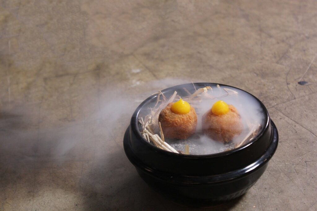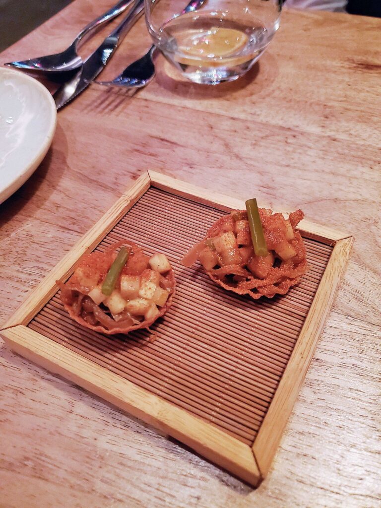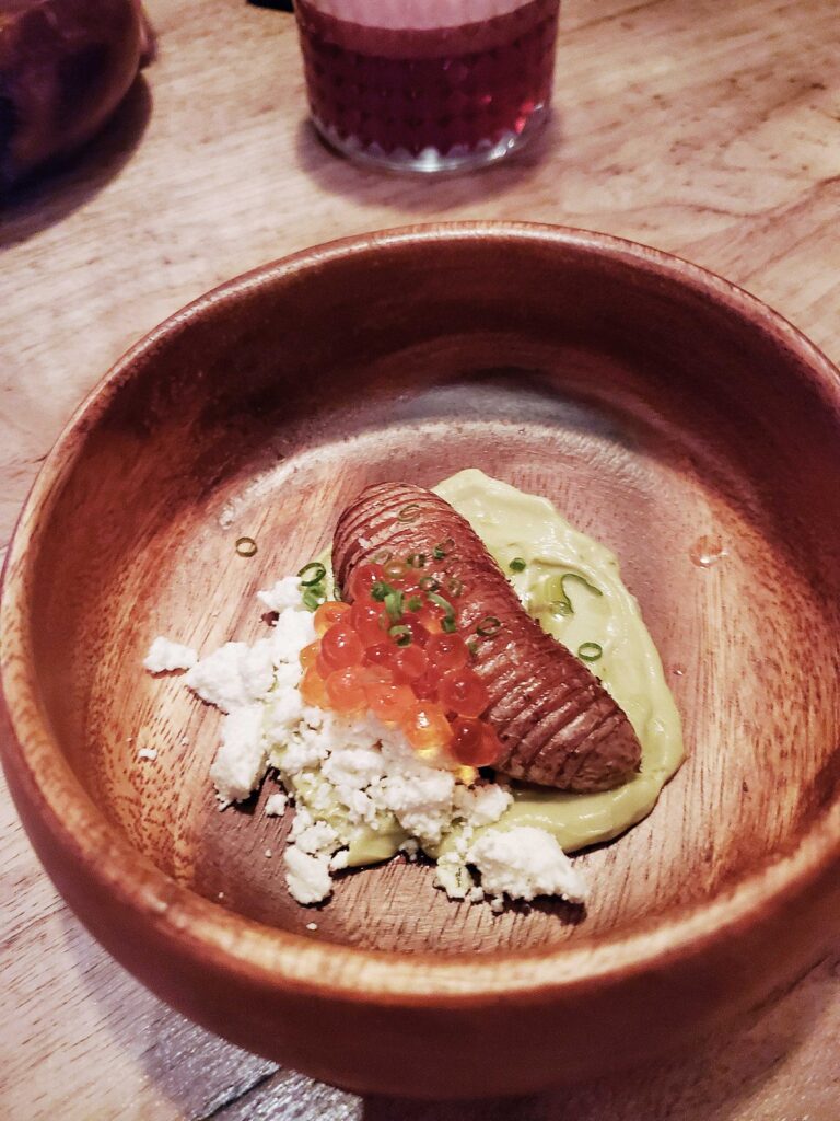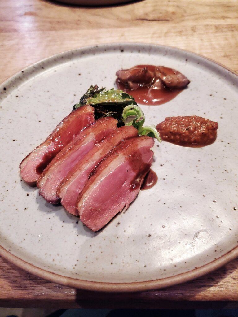 去年二月與友人前往Ration | Beverley用餐,彼時餐廳正式營業半年不到,但其頗具創新意味的食材搭配、烹飪手法,以及對於食物盡可能做到零浪費的環保實踐,都已經顯得相對純熟。吸收牛肉油脂香氣的小土豆搭配烟熏三文魚籽、牛油果泥、奶酪凝乳,清新和濃鬱的調味平衡結合,讓樸實土豆也變得口感層次豐富。極其薄脆的塔底中盛放自製腌洋葱、蒜芯、洋薑,簡單用甜椒粉調味,蔬菜綻放清爽怡口的味道。主菜的一鴨兩吃也讓人回味無窮。鴨胸肉烹製到鮮嫩又多汁的半熟狀態,帶有恰到好處的脂肪層、烤至非常脆的鴨皮。自製醬料據説融合近百種材料,味道豐富但不至於掩蓋鴨肉本身的香氣,肉類的鮮美汁水和天然脂香在舌尖跳舞。鴨腿肉被製成炸丸子,上桌后以乾草快速烟熏,外層金黃酥脆,内裡肉餡滾燙多汁,風味十足。