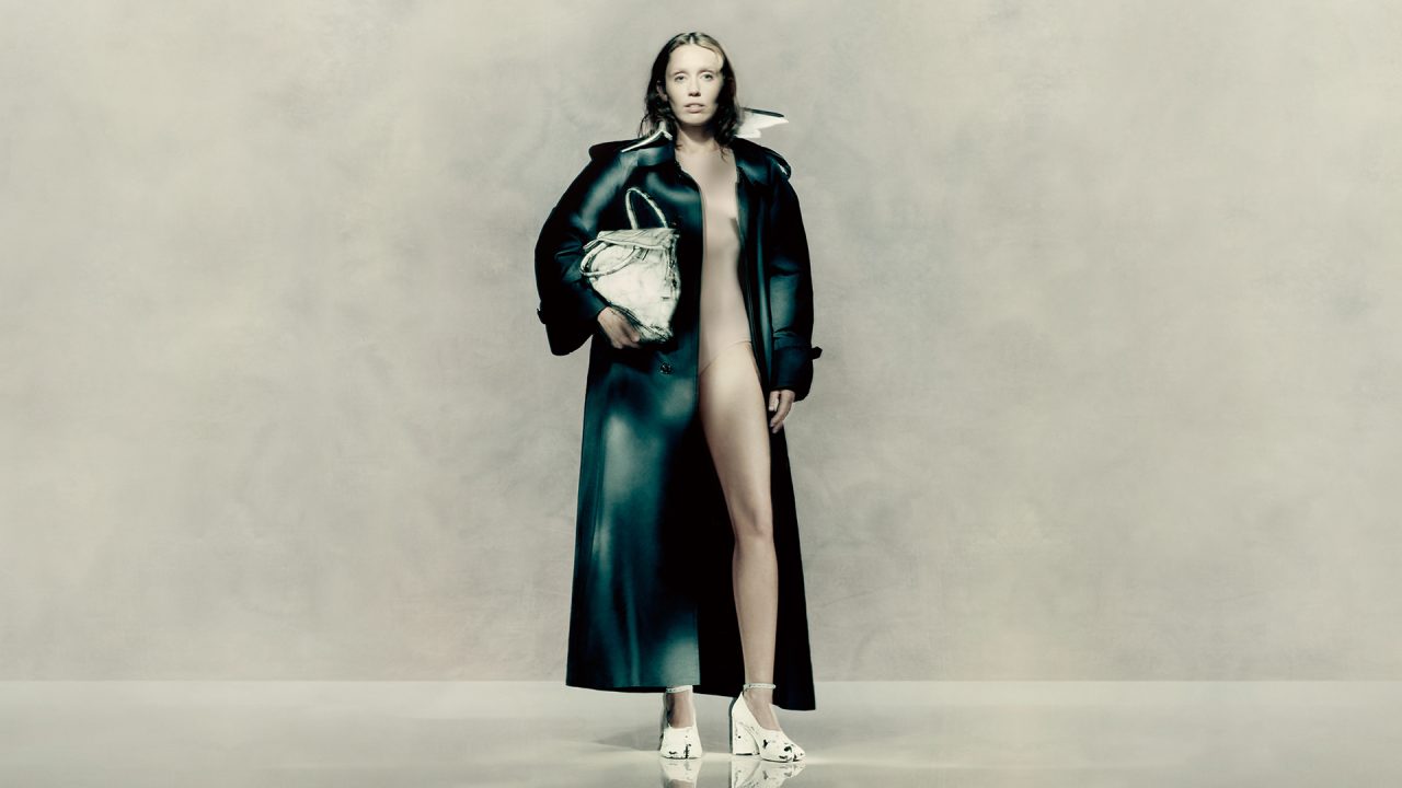 值得一提的是,本季再次出現 Margiela 最具代表性的 bianchetto 白色塗層技術。原本用於家具的這種塗白方式,能將衣物、物件甚至身體表面化為白色畫布,藉此突顯時間留下的痕跡。這次由麥莉·希拉親身演繹,部分影像裡幾乎赤裸,僅以白色塗料覆蓋全身,腳上踩著經典 Tabi 足袋靴。攝影師 Paolo Roversi用柔和卻具張力的鏡頭語言,捕捉下 Cyrus 與品牌精神合而為一的瞬間。這樣的畫面既挑釁又詩意,正好呼應 Margiela 一直以來的創作哲學:將不完美、被忽略或被遺忘的元素,轉化成值得珍藏的當代美學。