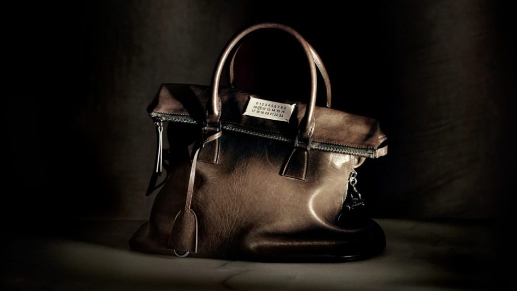 延續品牌一貫的解構精神,這一季的洋裝、裙裝與上衣設計出了「內外翻轉」的趣味。羊毛百褶裙可以由裡往外穿,緞面洋裝則將肩墊與汗墊外翻,成為意想不到的裝飾。法蘭絨大衣翻轉後,閃亮的羊毛金屬紗內裡成為表面,男裝長褲被縫補在上衣上,變形為一件無袖洋裝。蕾絲禮服疊加彩色薄紗,針織衫外罩紗布與棉紡布,營造出視覺上的錯覺。配件方面,品牌經典的 5AC 包款以軟質無內襯新姿態亮相,透過上蠟工藝,讓使用痕跡更快浮現。新推出的 Dress-Age 包系列則以梯形結構呼應「不受時間限制的服裝語彙」,材質選用荔枝紋小牛皮與麂皮內裡,低調卻細膩。鞋履同樣呼應歲月主題,從尖頭皮鞋到運動鞋,每一雙都經過手工腐蝕與做舊處理,連鞋底的釘痕都拼湊出 MM 的標誌。