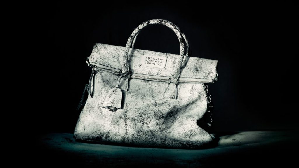 延續品牌一貫的解構精神,這一季的洋裝、裙裝與上衣設計出了「內外翻轉」的趣味。羊毛百褶裙可以由裡往外穿,緞面洋裝則將肩墊與汗墊外翻,成為意想不到的裝飾。法蘭絨大衣翻轉後,閃亮的羊毛金屬紗內裡成為表面,男裝長褲被縫補在上衣上,變形為一件無袖洋裝。蕾絲禮服疊加彩色薄紗,針織衫外罩紗布與棉紡布,營造出視覺上的錯覺。配件方面,品牌經典的 5AC 包款以軟質無內襯新姿態亮相,透過上蠟工藝,讓使用痕跡更快浮現。新推出的 Dress-Age 包系列則以梯形結構呼應「不受時間限制的服裝語彙」,材質選用荔枝紋小牛皮與麂皮內裡,低調卻細膩。鞋履同樣呼應歲月主題,從尖頭皮鞋到運動鞋,每一雙都經過手工腐蝕與做舊處理,連鞋底的釘痕都拼湊出 MM 的標誌。