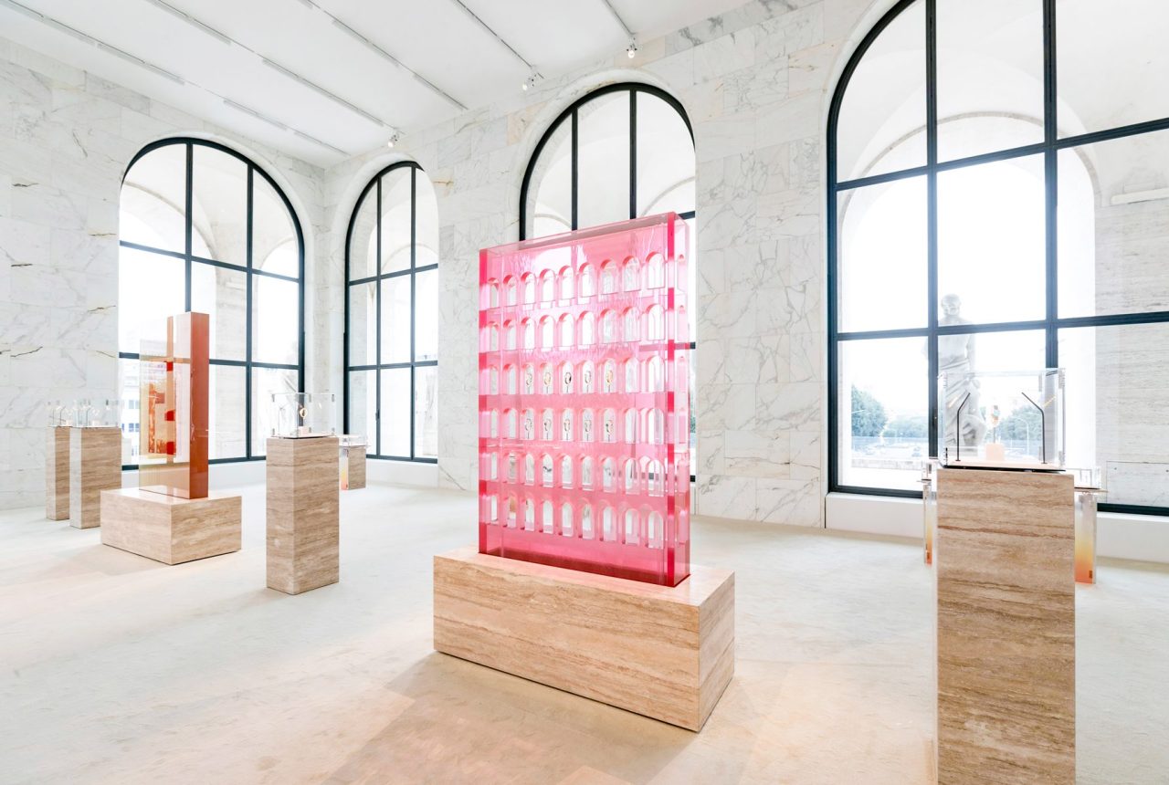 為Forever Fendi系列腕錶的首次面世,芬迪特意委託了荷蘭設計師Sabine Marcelis在展廳中心使用樹脂製作了以文明宮為參考模板的粉色噴泉,該係列腕錶則放置在這個晶瑩剔透的噴泉內部空間,這樣既不妨礙從外面以各個視角欣賞它們,又給它們營造出了一種高貴閃亮的感覺。