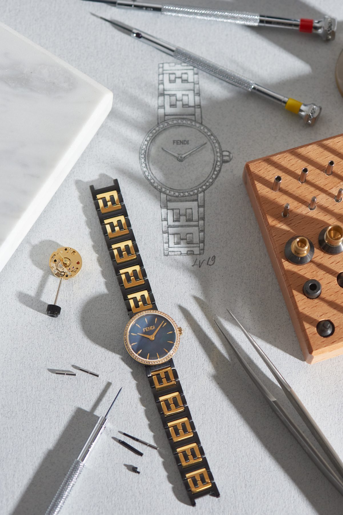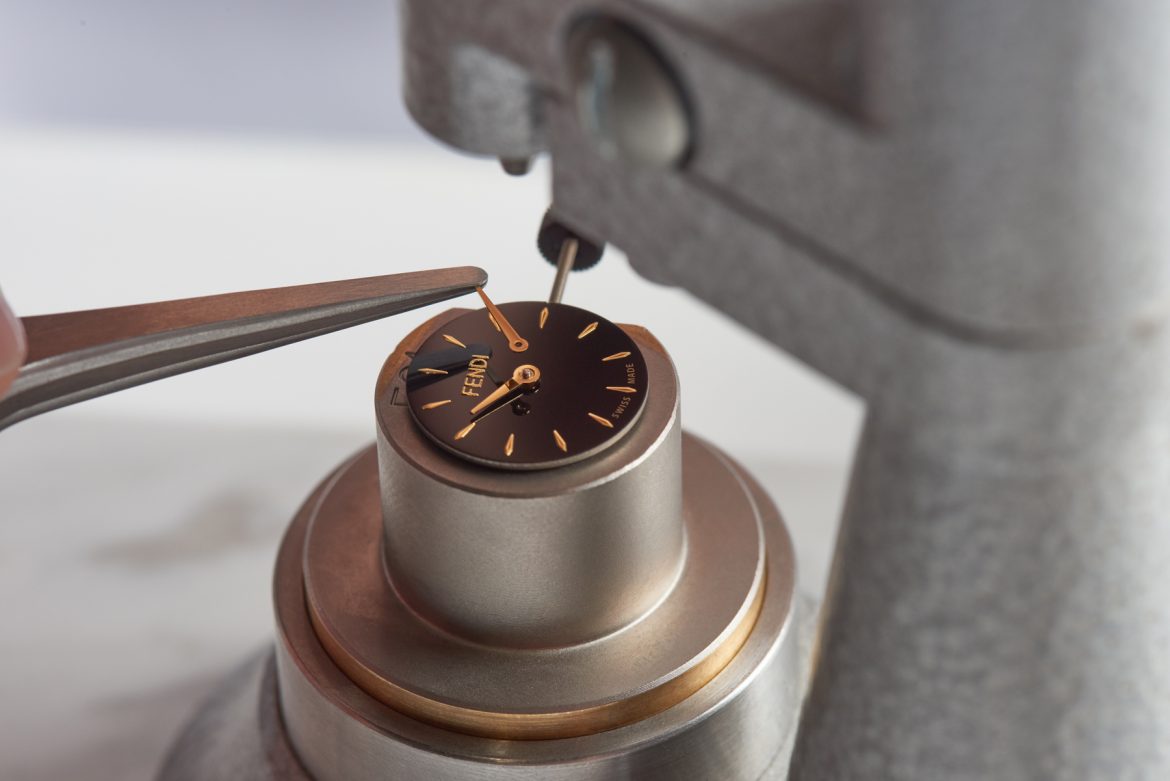Forever Fendi系列腕錶的揭幕之旅除了上述的一些體驗之外,總部的一樓展廊還展出了工匠們在加工組裝及拋光珍珠母貝錶盤的工作室。還有一處展示了這個品牌標誌性的Policromia 系列腕錶的定制服務,該系列在2016年發佈,由Venturini Fendi的女兒,珠寶設計師Delfina Delettrez Fendi設計。這個定制服務可以讓你從超過10萬種寶石、岩石和材料的外觀組合中任意挑選,所以每一枚成品手錶幾乎都是獨一無二的。芬迪這一標誌性的定制服務專門滿足那些眼光最為挑剔的高端顧客。