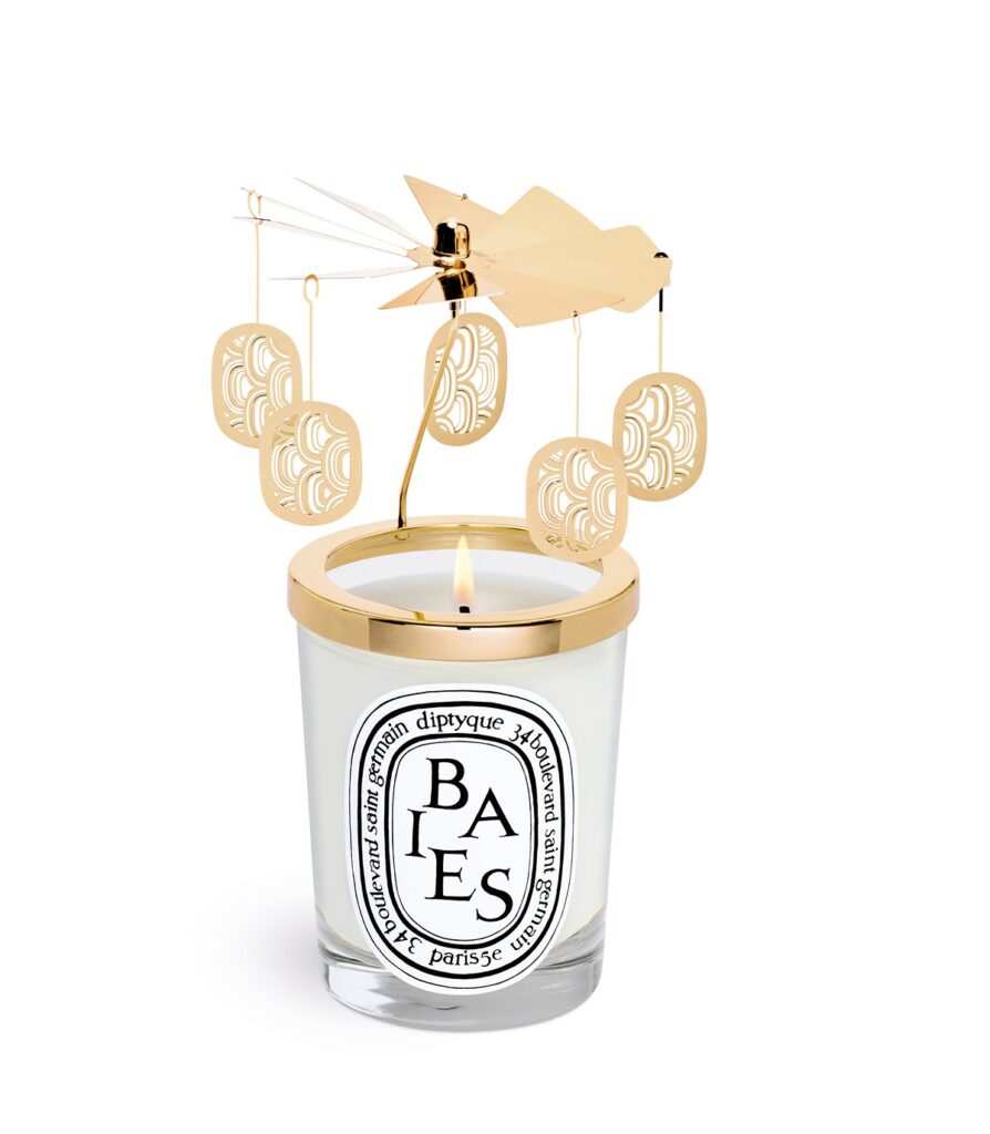 限量版金色走馬燈讓一款香薰蠟燭變成富有藝術氣息的居家擺設,書寫一個迷人的冬季童話故事。就像圍繞太陽的行星一樣,走馬燈和 Diptyque 標誌性橢圓形吊飾將圍繞著蠟燭火焰旋轉。作為品牌的標誌性香味之一BAIES 結合了剛採摘的黑醋栗漿果的清爽果香和玫瑰的活潑花香,用香味描繪出一座野生花園。