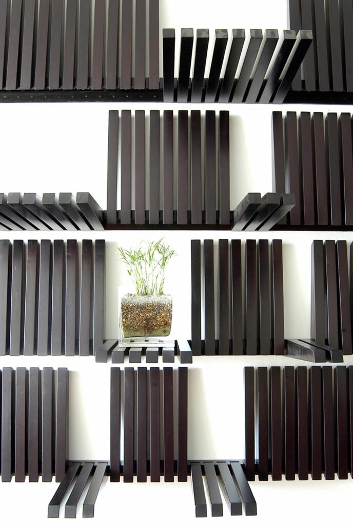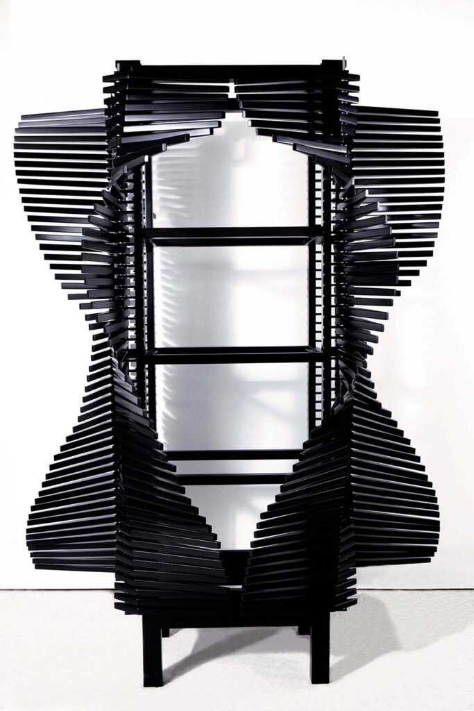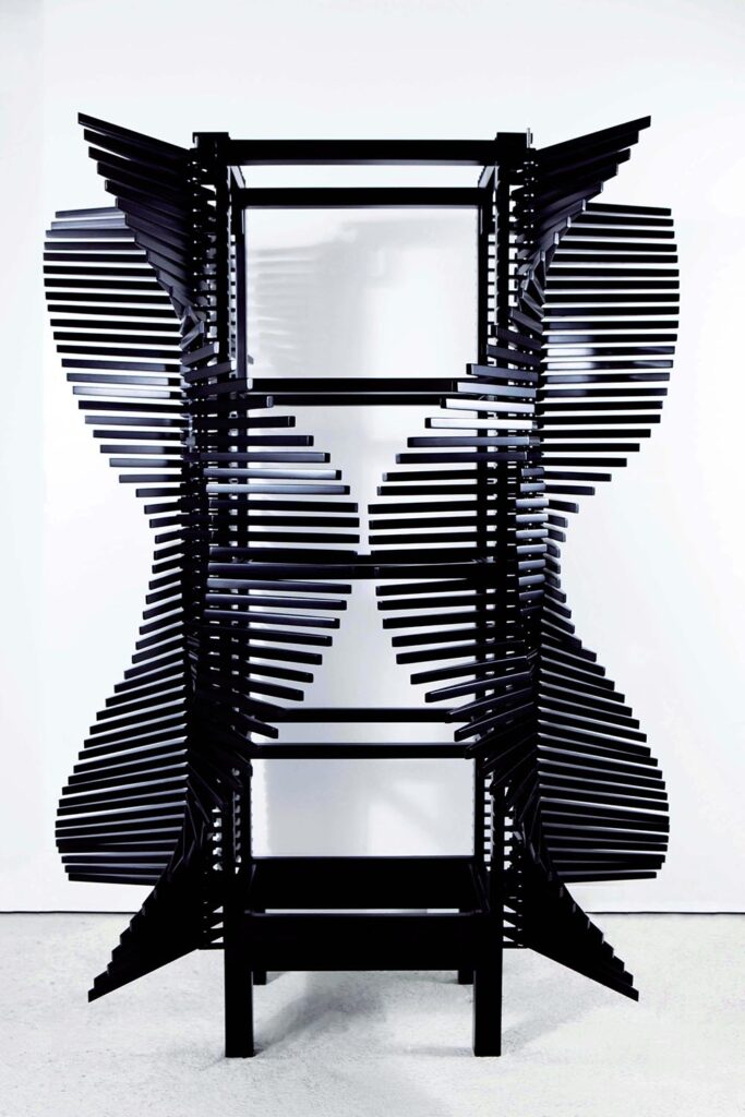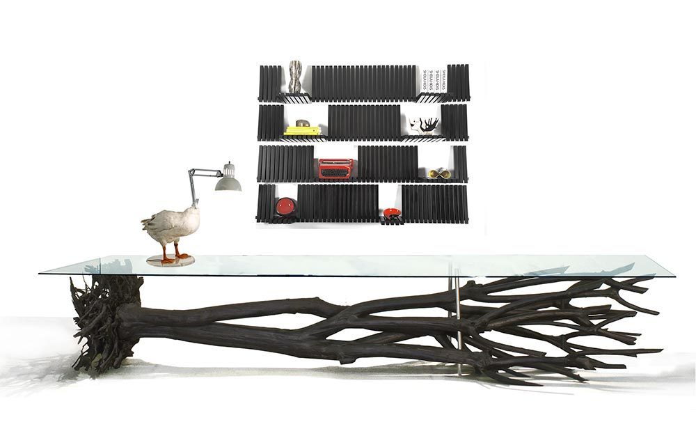 他於是思考,爲何千百年來,人們都習慣於用樹木切割出木板製作傢俱?於是他打破陳規,選擇保留原始形態的樹木製作出長桌,因爲無論人的設計如何精巧,都無法媲美大自然的鬼斧神工,而那些已死亡、倒下的樹木,就好像被再次賦予了生命。再或者,Errazuriz不屑於普通櫥櫃的固定打開方式,創造出《Samurai Cabinet》等一系列以上百根可活動骨架搭建的櫥櫃,只需要用手指輕輕移動骨架,人們從任何角度都可獲取櫥櫃中的物件,這種革新設計也使得櫥櫃擁有了無限制自由變換的外觀。似乎,在Errazuriz的世界,規則二字從不存在。