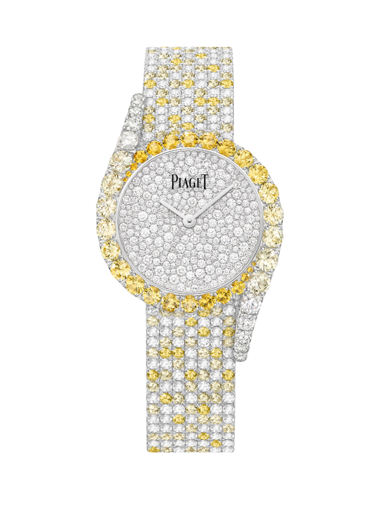 Limelight Gala是伯爵盡顯大膽創意的一個系列,起源於上世紀七十年代的不羈風尚與伯爵的精湛工藝融於一體,其唯美流暢的曲線及渾圓錶殼兩側延伸而出的不對稱錶耳,已成為品牌標誌性設計之一。2021新款Precious Zenith腕錶展現的是正午驕陽。錶殼為18kt白金,錶盤以雪花鑲嵌工藝舖鑲289顆鑽石,表現太陽中心的耀眼光明。錶圈環繞鑲嵌32顆總重約4.70克拉的明亮式切割黃色藍寶石及10顆明亮式切割鑽石。隨著向錶耳延伸,色彩由最濃鬱的艷黃色逐漸暈染淡化,直至無色透明,恰如艷陽輻射而出的光芒。以不同色度的彩色寶石與鑽石呈現顔色遞進,銜接自然,色彩流動,可見伯爵寶石大師的精妙用心與傑出技藝。錶帶的配色與錶圈渾然一體,密鑲276顆總重約9.95克拉的鑽石及124顆總重約4.58克拉的黃色藍寶石,深淺各異,錯落有致,猶如星星點點的的烈日光斑,美不勝收。Precious Zenith滿鑽腕錶堪稱藝術臻品,限量僅8枚。