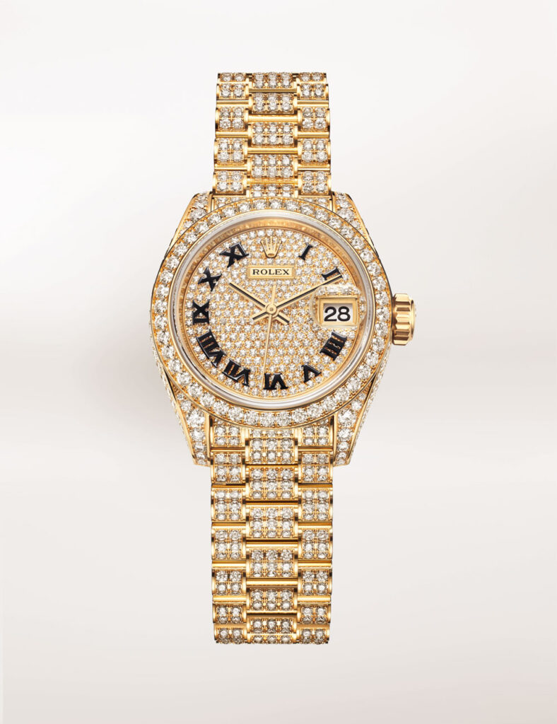 Lady-Datejust系列是勞力士經典系列Datejust的延續與升華,將Datejust的高貴氣質凝聚在28毫米的錶殼中,小巧玲瓏,更適合女性的纖細手腕。這款最新Lady-Datejust腕錶以18kt黃金製造,通體鑲鑽,光彩奪目。錶身總計鑲嵌1089顆鑽石,其中錶面密鑲291顆圓形鑽石,搭配18kt黃金黑色羅馬數字,規整典雅。獨樹一幟的三格實心鏈節的元首型(President)錶帶上鑲嵌596顆鑽石,圓潤靈動,隨著鏈節起伏,流光溢彩環繞腕閒。
