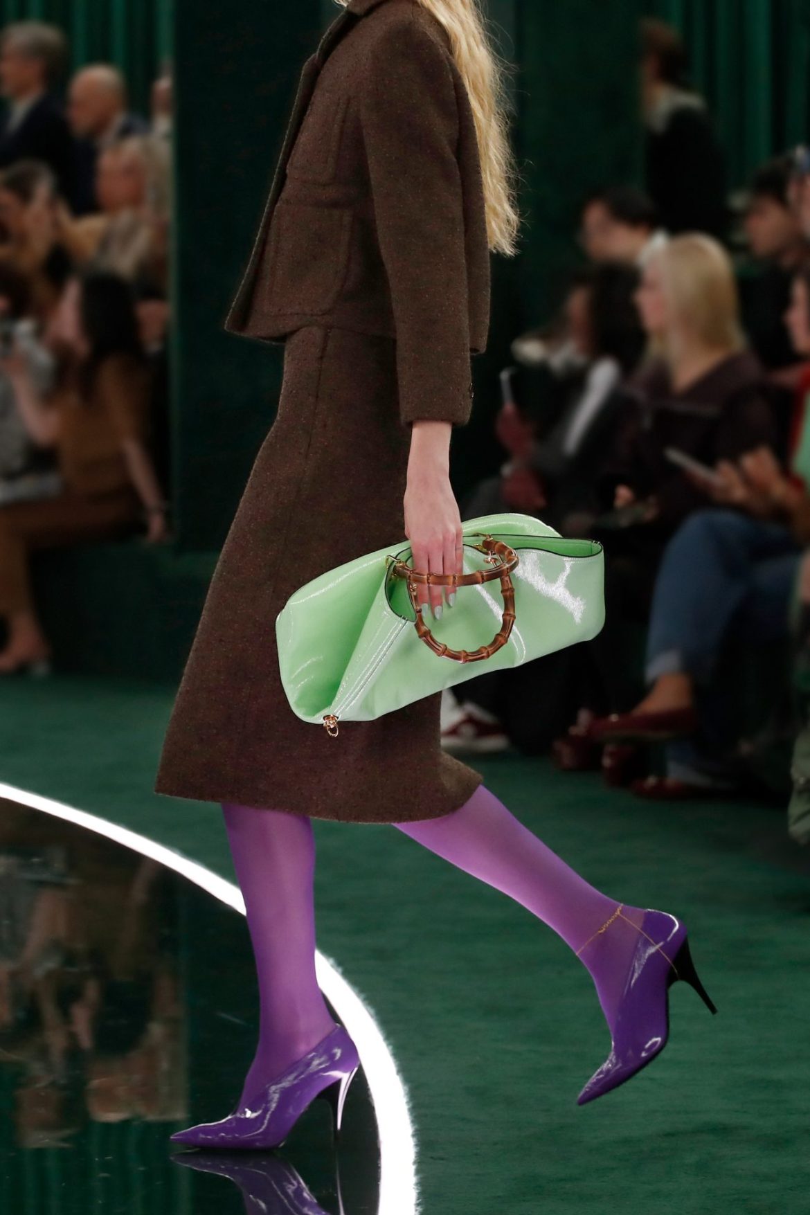 材質與色彩之間的對立更強烈地體現了古馳對於二元美學的探索。濃烈的金屬質感、華美刺繡與厚重的天鵝絨頻頻出現,而顏色則以極具衝突的搭配呈現,例如充滿生命力的森林綠半裙與冷豔的紫色大衣、光滑絲綢與硬挺風衣的搭配,營造出視覺與觸覺的豐富對比。此外,品牌亦大膽嘗試實驗性質料,諸如珍珠母貝皮革、特殊處理的塗層羊毛,以及細膩的磨毛馬海毛襯衫等,在傳統中嶄露前衛的氣息,儼然成為古馳表達新時代精神的鮮明語彙。