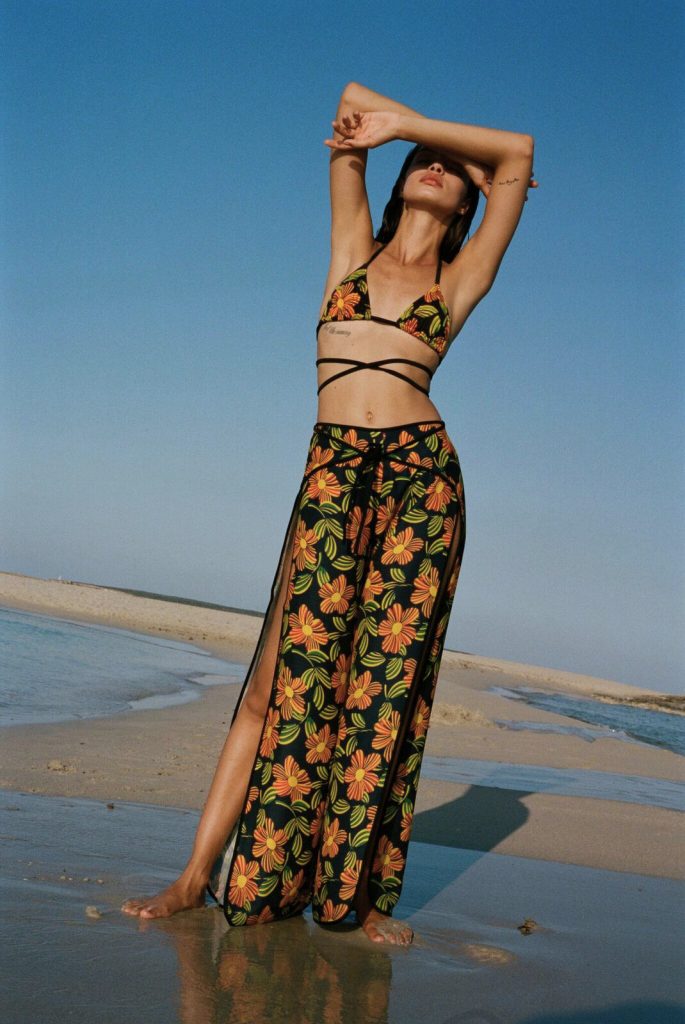 由設計師Alexandra Miro於2017年成立,這個剛剛起步的品牌已經在社交網絡上有了一定的名氣。相對於另外兩個品牌的少女風,Alexandra Miro則展現了成熟女性的魅力。設計師致力於通過極簡設計,來展現現代摩登女性身體曲線的姿態以及力度。因此泳衣的設計非常的簡潔,大多為純色無花紋,顏色的選擇也相對深沉,同時使用了腰帶一類的細節,不僅可以用來修飾腰身,還會在視覺上顯得雙腿修長。除了泳衣,如今的度假裝不再僅僅有擋風或是遮陽的功能,凹造型也是消費者的關注點之一,而Alexandra Miro的度假裝很好的迎合了這一需求。她家的度假裝運用了非常有辨識度的幾何花紋,顏色或鮮豔或對比明顯,寬大的裙擺,走起路的時候隨著步伐飄起,展現出了十足的氣場。