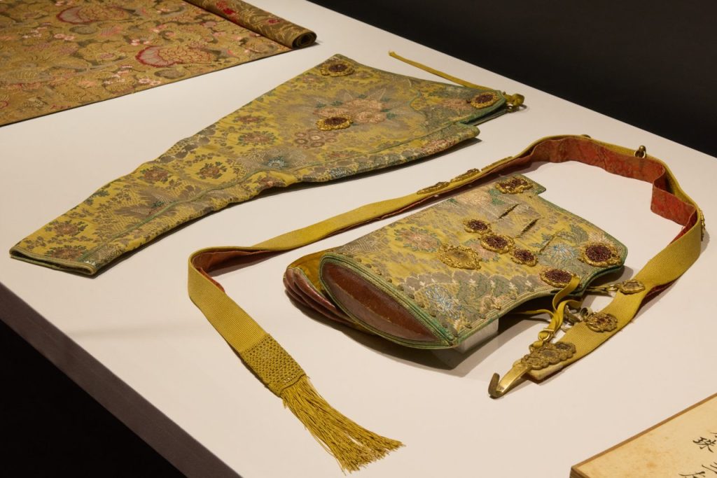 清宮中這件櫜鞬所使用的法國錦緞,表面裝飾帶有典型的對稱蕾絲圖案,這是18世紀法國流行的設計風格,常見於宮廷服飾、家具裝飾與宗教織品。這類織物以其複雜的機織技法與精緻的浮雕效果著稱,反映了當時法國絲織業的高超水準。清朝宮廷對法國絲織品情有獨鍾,乾隆時期大量進口法國錦緞,用於宮廷服飾、帳幔、座椅裝飾與武備裝飾。此外,清宮工坊也試圖模仿法國技術,在江南絲綢產地如蘇州、杭州,嘗試仿製歐洲風格的絲織品,形成一種融合東西方特色的獨特織物風格。