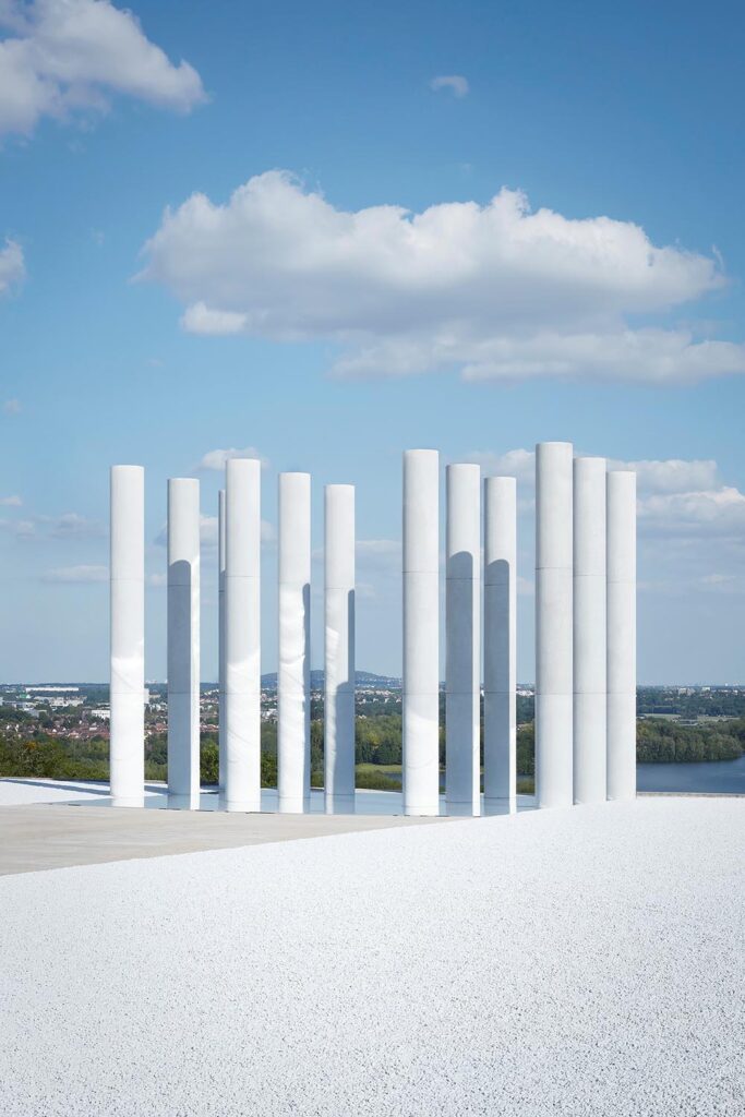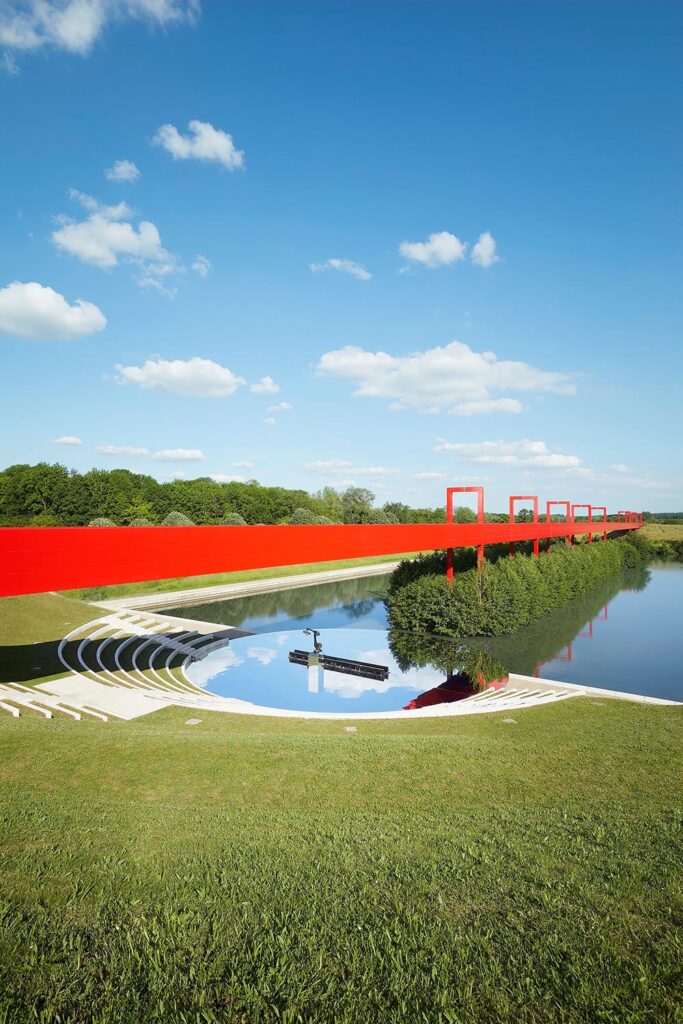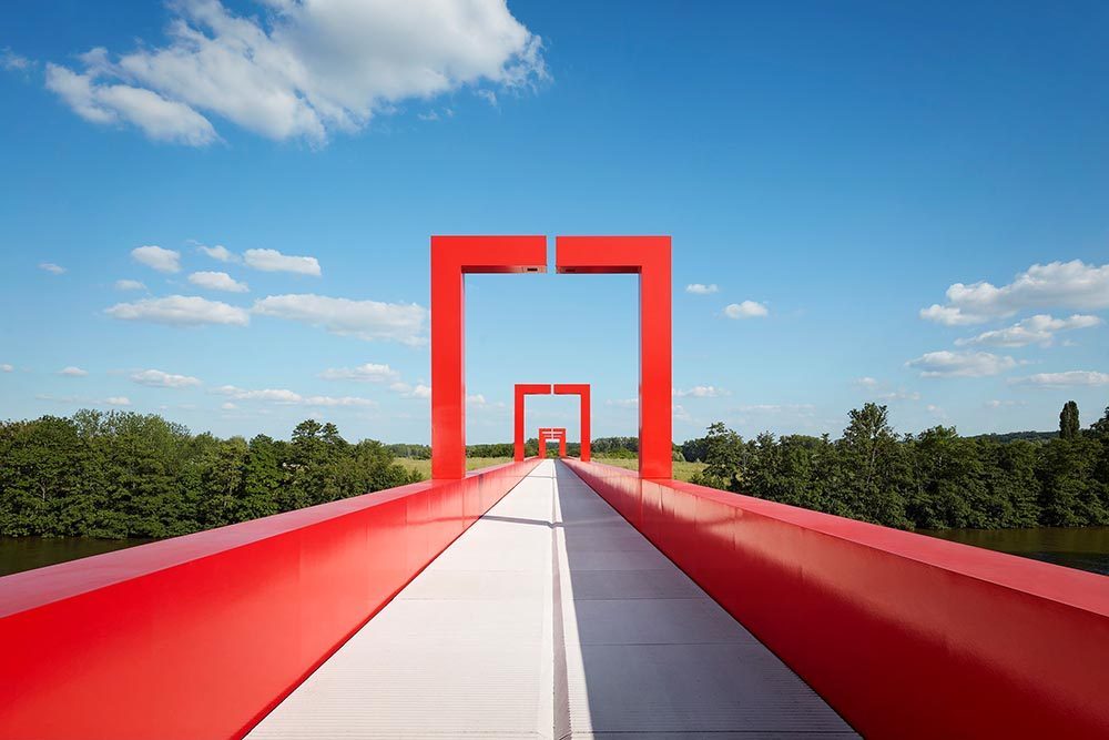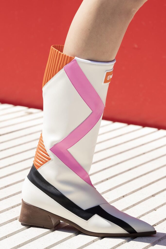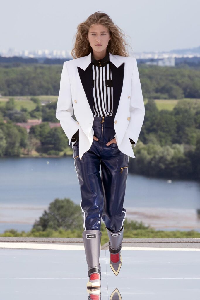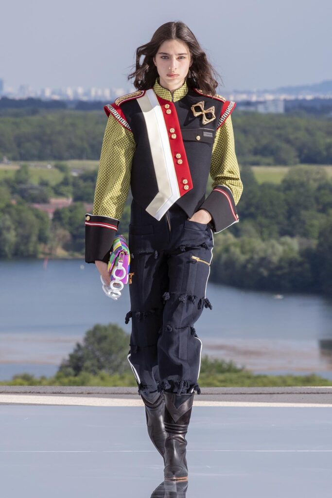 由路易威登女裝藝術總監Nicolas Ghesquière呈現的2022早春系列女裝大秀選址法國Cergy-Pontoise由藝術家Dani Karavan 打造的Axe Majeur 藝術長廊。紅色的La Passerelle門廊遠看仿佛時光隧道,連接十二枚立柱組成的露天裝置Douze Colonnes,並設有鏡面效果的地面,映照出藍天白雲,和徐徐經過的模特兒隊伍,仿佛通過扭曲視覺效果來闡述時間的永恆。系列著重使用明艷、大膽的色彩,結合亮面材質、精緻刺綉、誇張廓形和裁剪等設計細節,讓人自然而然聯想到積極歡快的鼓樂隊,如此充滿自信和正能量!