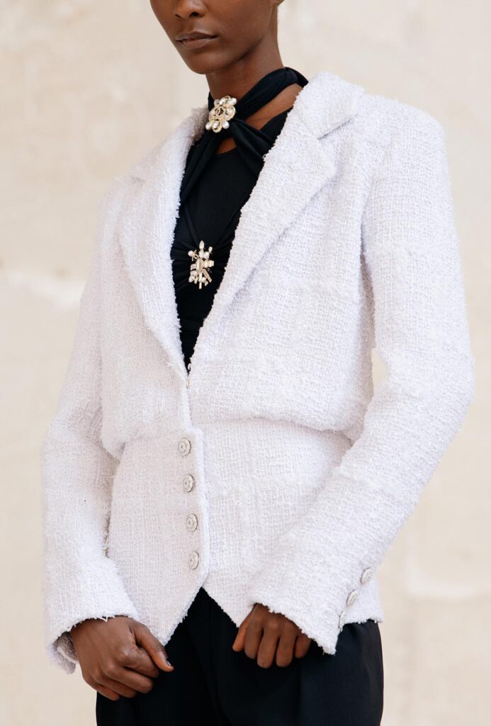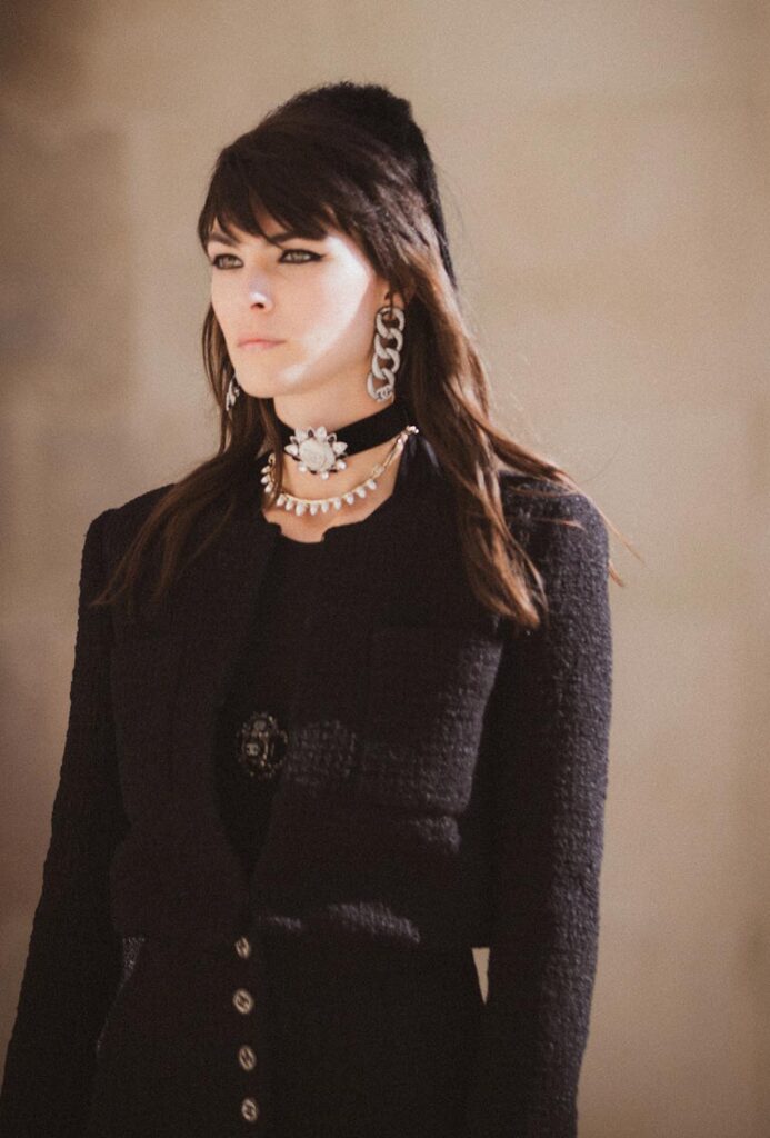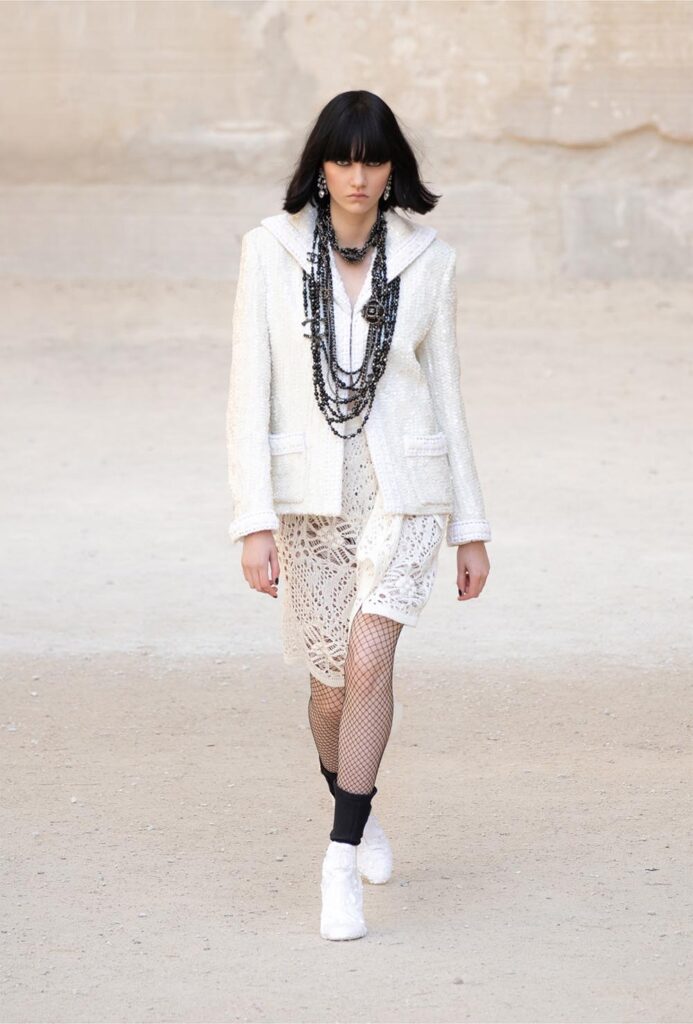 Gabrielle Chanel香奈兒女士所處的時代的巴黎,聚集著無數來自世界各地的藝術家、文人墨客、設計師、舞者。大概是有才華的人很容易被互相吸引,香奈兒女士身邊也總圍繞著至今都對社會有著深刻影響的大師們,其中就包括了法國詩人、劇作家兼藝術家讓·谷克多(Jean Cocteau)。香奈兒現任創意總監Virginie Viard這次便以2021/22早春度假系列致敬香奈兒女士和谷克多的友誼,以及Viard本人所愛的谷克多指導的電影《奧菲斯的遺囑》(Le testament d’Orphée)。明亮的白和深邃的黑貫穿整場大秀,結合大理石結構的秀場Carrières de Lumières製造出一場光影的游戲,以呼應谷克多電影的詩意、簡約和精準。同時,通過流蘇元素、穗帶裝飾的皮衣等設計符碼,香奈兒2021/22早春系列又被賦予了一種現代的搖滾氣質、朋克精神。