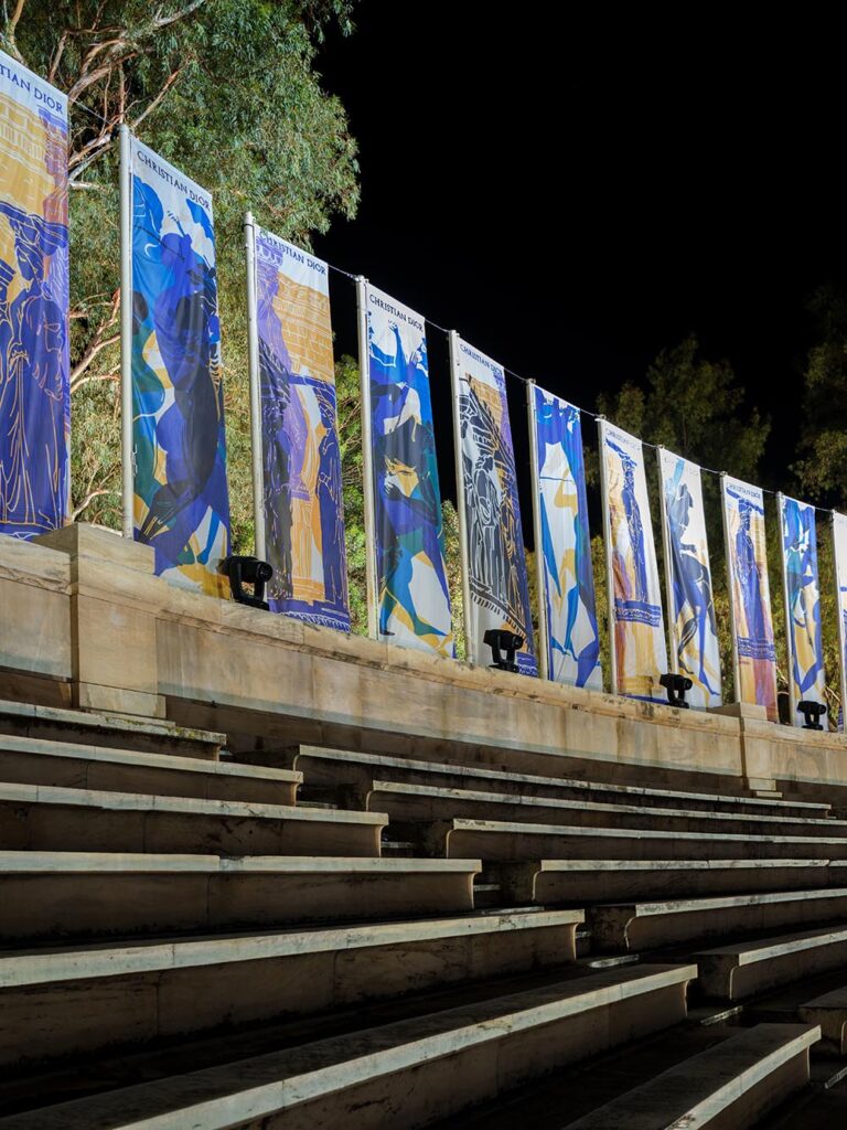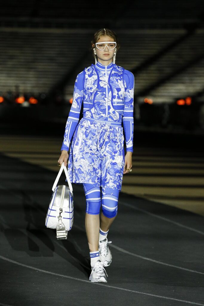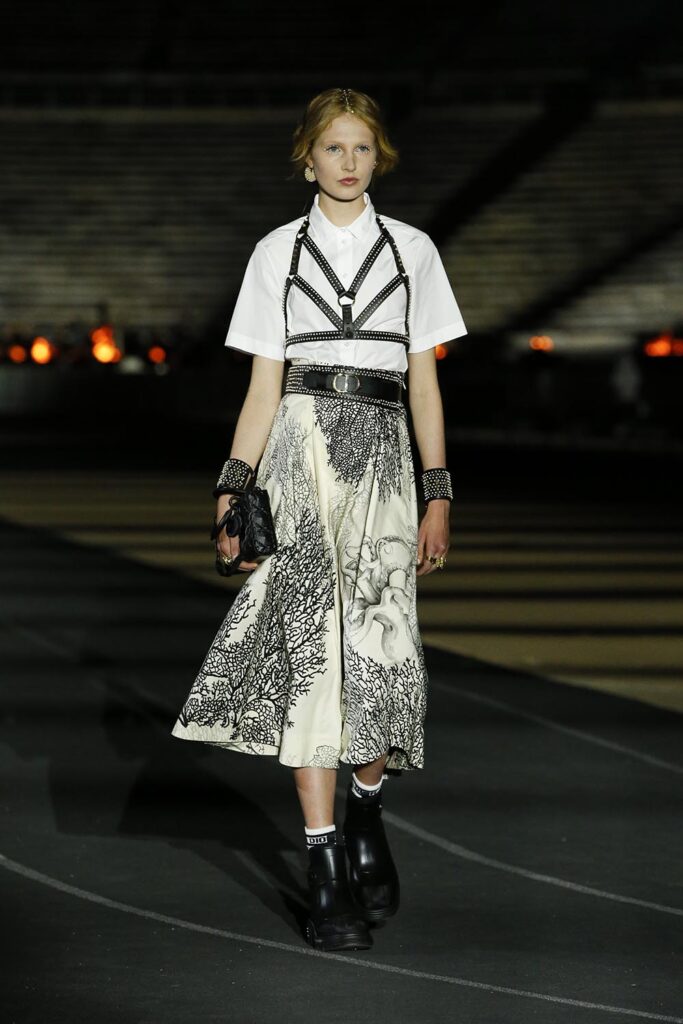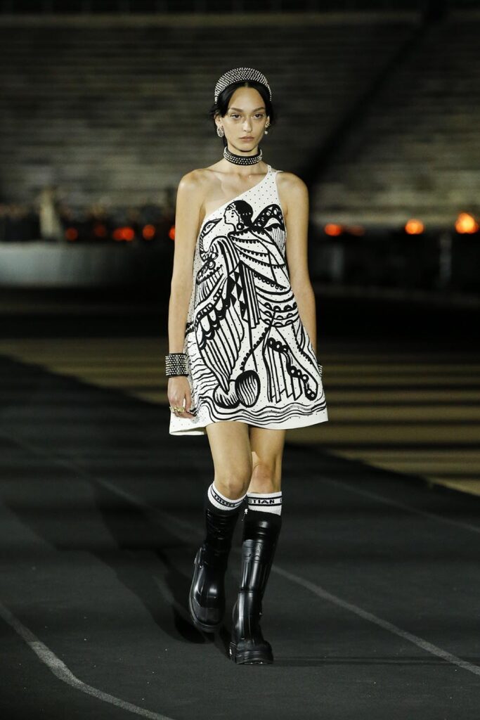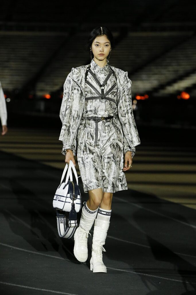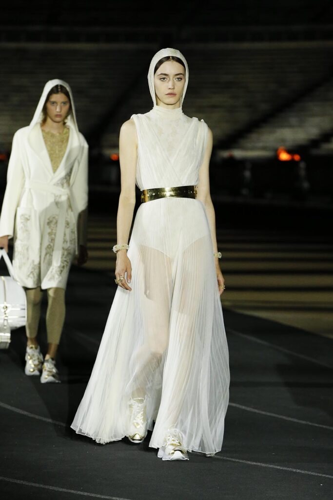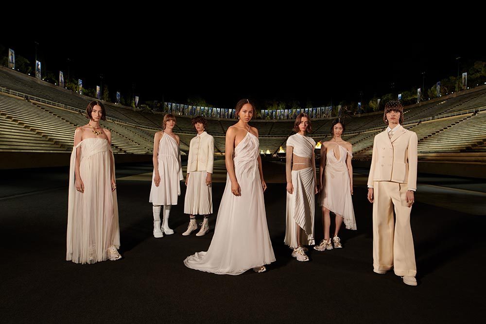 古希臘文化像是歷史長河中轉瞬即逝卻又異常璀璨的一顆星星,它的鼎盛時期延續僅僅逾百年,然而至今,西方文化都仍舊能尋找到古希臘文明留下的蹤跡。對於迪奧女裝藝術總監Maria Grazia Chiuri,重新探索某個文明的根源,不是懷舊,而是為了以現代視角重新組合起我們對於這個世界的正在趨於瓦解的認識。迪奧2022早春系列於希臘雅典帕那辛納克體育場中心揭幕,精心設計的燈光結合古老的建築帶來新舊交錯的美,好像過去和未來出現在了同個時空。金色、白色的大量運用是對古希臘文明的致意,而運動服裝、西裝和長褲等設計又是對現代自由格調的表達。