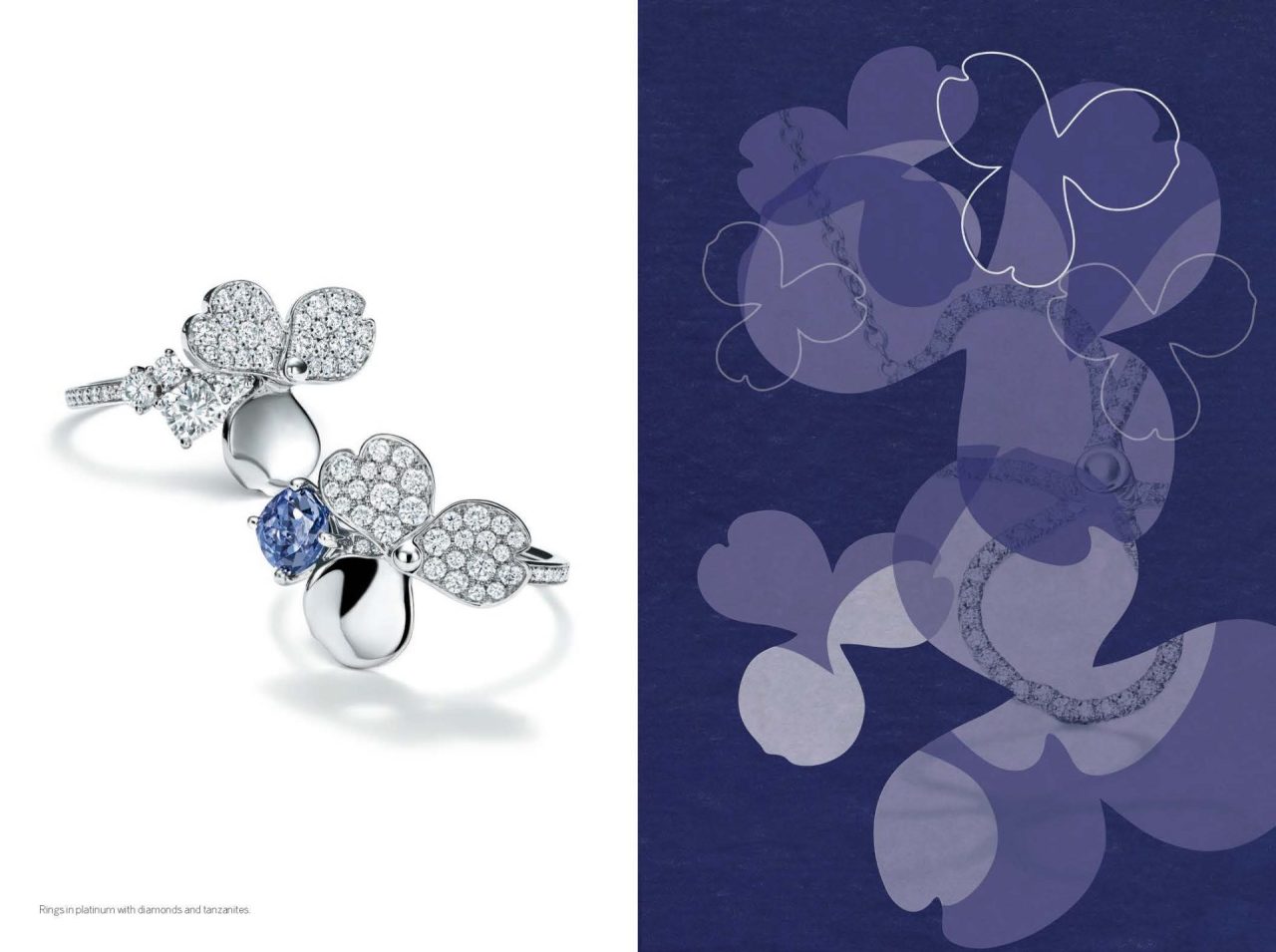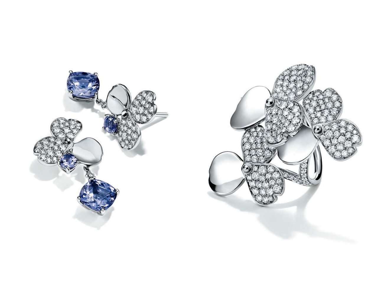 在基本款式中,鉑金與無色鑽石的搭配乾淨純粹。鑽石明亮璀璨,在鉑金花瓣的映襯下愈發熠熠生輝。為了讓作品更加生動,設計師在不同款式的花瓣間還點綴了藍紫色坦桑石構成的花苞,或是彩黃鑽石與無色鑽石搭配鑲嵌而成的螢火蟲,既豐富了造型,又增添了色彩與動感,令整件首飾看起來活潑靈動,栩栩如生。