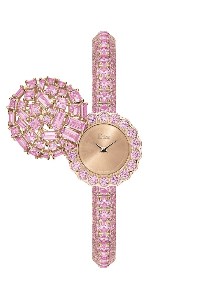 這是一件以時間為眼、以永恆作詩的精品,可旋轉的花型錶蓋下進退皆宜,時可偽裝為飾品,時則可大方地展現極簡素雅的錶面。自錶鍊、錶盤再到錶身,均飾有粉色藍寶石,另以玫瑰金呈現出細膩優柔的色彩。此款腕錶深具女性柔美特質,並充分彰顯出迪奧(Dior)卓越的珠寶工藝技術。