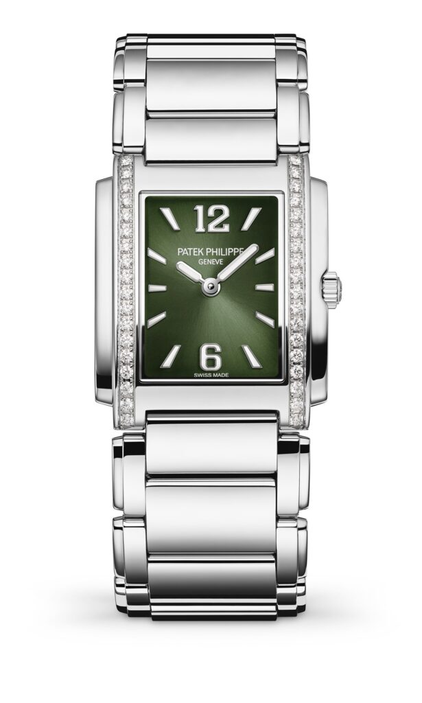 誕生於1999年的 Twenty~4 系列,為百達翡麗(Patek)眾多設計作品中闡述女性優雅化身的經典之作。此系列腕錶外形簡約洗鍊,精緻而現代的新橄欖綠色錶盤,突顯出錶面的刻度與數字,鑲於錶盤兩側、單邊各18顆的鑽石河道,內斂而沈穩,象徵現代女性幹練、明快的姿態。此腕錶包含鑲鑽玫瑰金及不銹鋼之款式,可因應任何場合,無論身著簡約時尚的正裝,亦或典雅的晚禮服,皆能相得益彰。