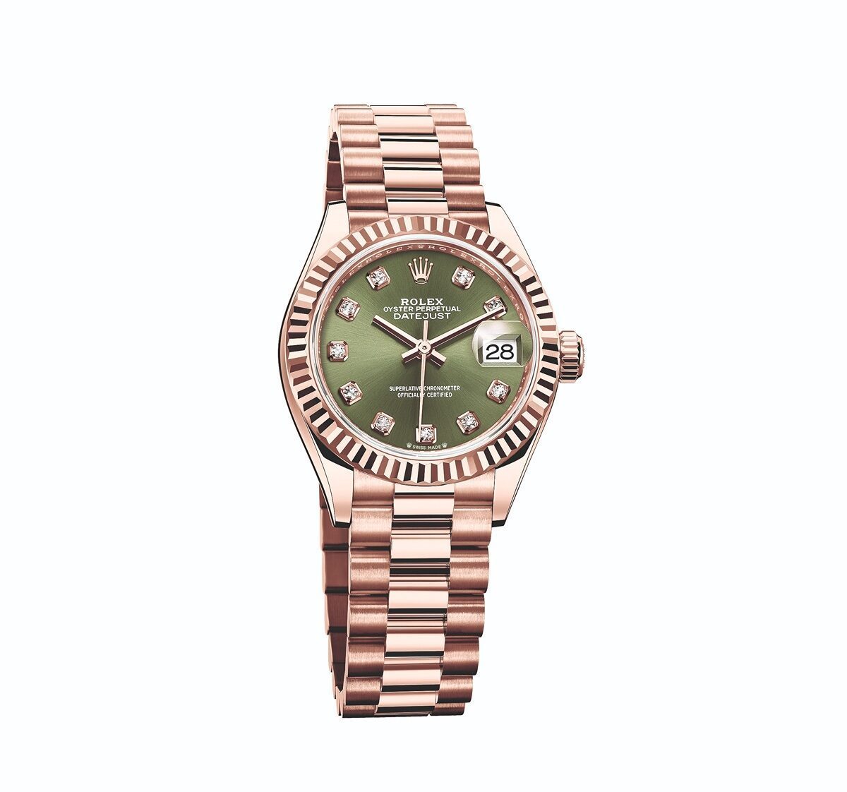 作為勞力士(Rolex)女錶中兼顧性能與設計感的標誌性款式,Lady Datejust早已是優雅風範的代名詞,並可透過不同材質的排列組合,以滿足佩戴者各式風格與偏好,直徑28毫米的蠔式錶殼,結合優雅輪廓美感及精巧纖細的比例。Lady Datejust 18kt永恒玫瑰金款,搭配鑲鑽橄欖綠色錶面及紀念型錶帶,如此配色很難讓人不聯想起以金色和綠色充斥的聖誕節氛圍。為保持粉紅金腕錶的美態,勞力士在2005年通過其鑄造廠創製出18kt永恒玫瑰金,並為這種粉紅合金取得專利。