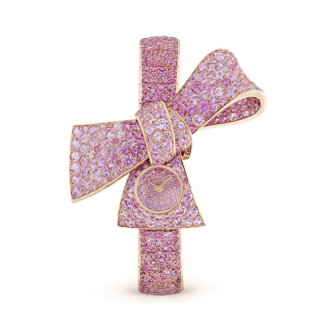 擅於將感性寄情予時間刻度的精密維度、揉合珠寶與精湛製錶工藝的梵克雅寶(Van Cleef & Arpels),總能捕捉最瑰麗的時刻。本次帶來打破傳統腕錶形式的作品,將以18kt玫瑰金打造的錶盤隱身至絕美的粉色寶石叢中,並以具織物絲緞感流動的線條延伸,細緻而優雅,特殊造型不僅帶來如節日拆禮喜悅而歡快的氛圍,更好似一位身心合一的靈魂伴侶,為佩戴者帶來一份特殊的親密感。
