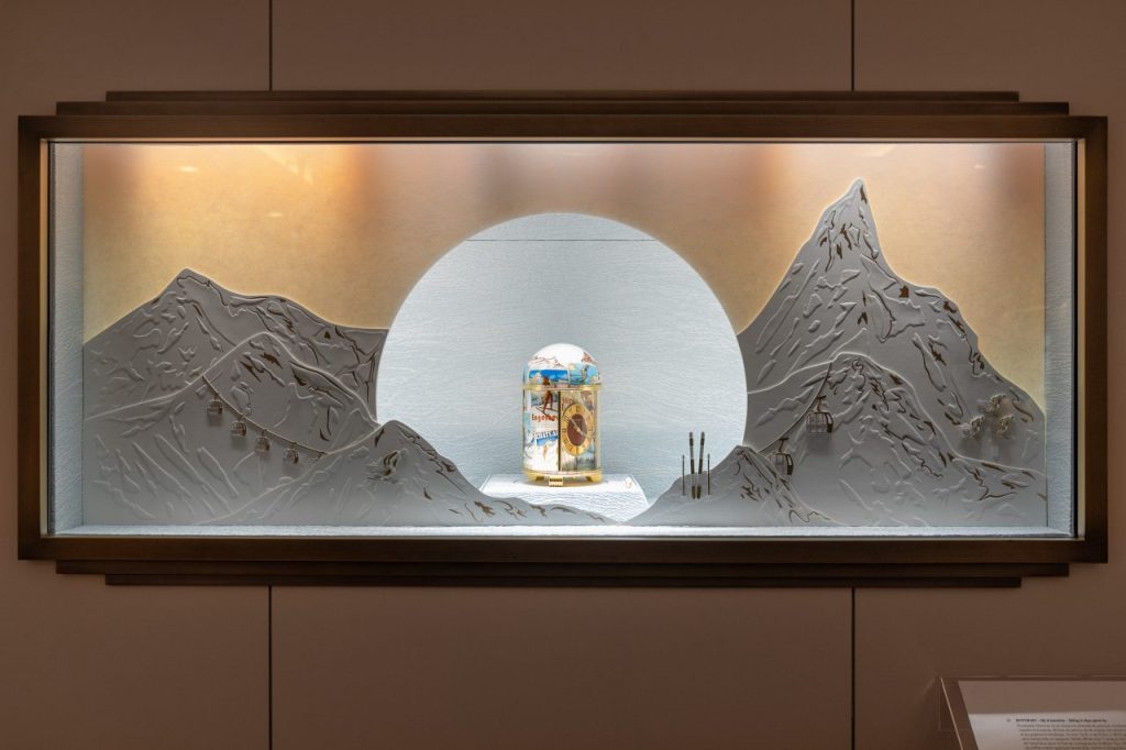 在眾多展品中,有兩件作品格外引人注目。其一是「昔日滑雪風情」(Pastoral Ski Scene Dome Table Clock),這款拱頂枱鐘以掐絲琺瑯搭配微繪琺瑯,重現了二十世紀中期阿爾卑斯山的冬日旅遊氛圍。構圖靈感來自瑞士平面設計的黃金年代,鮮明的色塊與俐落線條勾勒出纜車、雪道與度假村的意象。畫面不僅呈現懷舊的滑雪文化,也喚起了當地經濟與觀光業曾經的繁盛景象。琺瑯師以多層次的釉彩,細膩處理雪地反射的光影,讓人彷彿能感受到寒風拂面的真實感。這件枱鐘既是對瑞士文化的致敬,也是工藝師將歷史再現於當下的證明。
