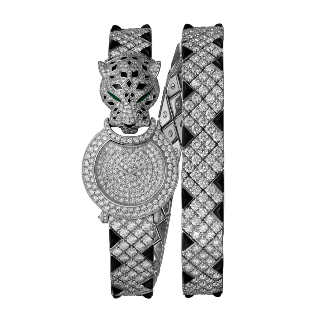 CartierLa Panthère從1914年首次面世開始,美洲豹便成爲了卡地亞的代名詞之一。近百年來,卡地亞美洲豹不斷「成長」,演化成數不清的珠寶、腕錶、裝飾物設計。不久前發佈的卡地亞La Panthère美洲豹高級珠寶腕錶,在展現桀驁不羈的魅力的同時,又因其細長造型而帶有了幾分柔美。鍍銠白金錶殼、錶鏈、美洲豹頭以及錶盤鑲嵌圓形明亮式切割鑽石,搭配遍佈錶鏈的金字塔形黑色尖晶石營造出豹紋圖案。狹長的美洲豹眼由梨形祖母綠寶石製成,每當佩戴者查看時間,美洲豹亦炯炯有神地回望著佩戴者。 |