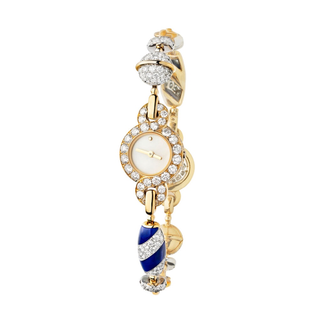 CHANELVolute Vénienne自嘉柏麗爾·香奈兒(Gabrielle Chanel)女士於上世紀二十年代隨好友初次造訪,威尼斯(Venice)便成為了她最為鍾愛的城市之一。宮殿的神秘、教堂的靜謐、拜占庭式馬賽克裝飾的耀目……專屬於威尼斯的濃烈而高雅的獨特氣質令她心醉沉迷,也為香奈兒女士帶來無盡設計靈感。為向這座城市致敬,香奈兒推出Escale à Venise頂級珠寶系列,以現代視角詮釋威尼斯之美,70件獨樹一幟的珍品喚起世人對於「水城」的嚮往。其中Volute Vénitienne腕錶以白金、黃金、鑽石以及藍色青金石製成,其配色、繩結造型錶盤,瞬間便讓人聯想起威尼斯運河上貢多拉小船靠岸連結纜繩時使用的藍白相間泊船柱。寶石仿佛幻化成樂符,串起了一首香奈兒為威尼斯譜寫的讚美之歌。 |