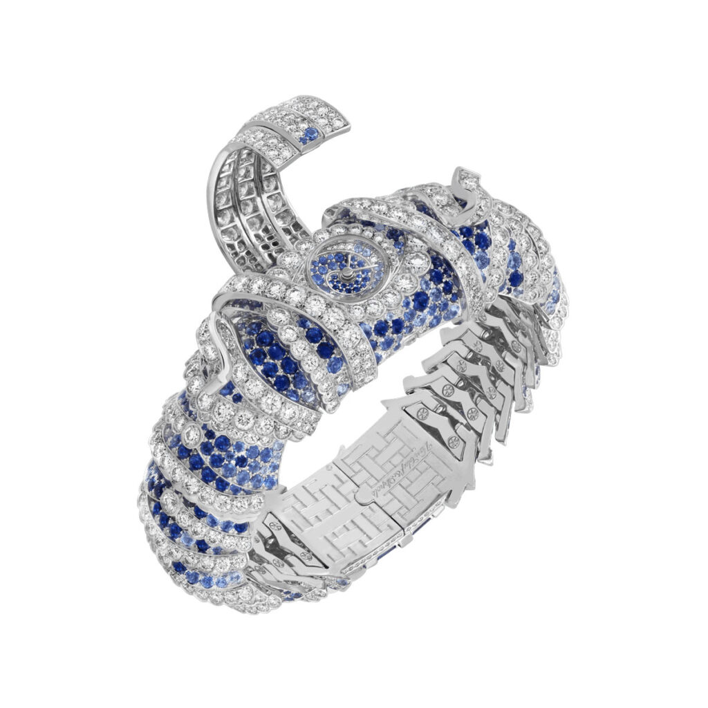 Van Cleef & ArpelsUlysse & Pénélope愛是穿插在梵克雅寶作品中永恆的主題。一件件精妙珠寶,仿佛也訴説著一段段動人的愛情故事。譬如Ulysse & Pénélope secret 腕錶,以古希臘史詩《奧德賽》(Odyssey)為靈感來源,讚頌佩涅洛佩(Penelope)對其丈夫,英雄尤利西斯(Ulysses)矢志不渝的忠貞。尤利西斯在海上漂泊的十年中,佩涅洛佩在白日紡織,又在夜間拆解織物,以此擺脫衆多追求者,同時等待丈夫歸來。白金、藍寶石、鑽石仿佛化作了佩涅洛佩的織物,繾綣纏繞於腕錶之上。隱藏於「緞帶」之下的錶盤上佈滿藍寶石組成漩渦造型,象徵尤利西斯漂泊的愛琴海上的波浪。寶石鍛造的織物造型、漸變色藍寶石的交叉排列,隱喻佩涅洛佩、尤利西斯情感的交織,浪漫且富有詩意。 |