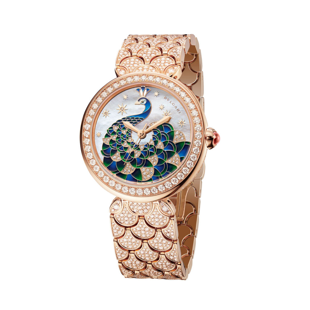 BulgariDivas’ Dream Peacock Diamonds寶格麗於2021年發佈三款Divas’ Dream高級珠寶腕錶,以多種視角、高飽和色彩融合精湛工藝,將孔雀高貴、神秘之美展現得淋漓盡致。寶格麗運用可追溯至中世紀的Champlevé琺琅技術,先在錶盤上雕刻出孔雀造型輪廓,再進行手繪填充色彩。孔雀高傲地浮現於Divas’ Dream Peacock Diamonds珠寶腕錶的珍珠母貝錶盤之上,十四種濃烈手繪色彩與珍珠母貝雅致的光澤形成强烈對比,使得腕錶造型富有立體感,色彩具有層次感。遍佈腕錶的扇形圖案汲取靈感於古羅馬時代卡拉卡拉浴場的馬賽克圖案,延續了Divas’ Dream系列特色,也是品牌對於其誕生地歷史的頌歌。 |