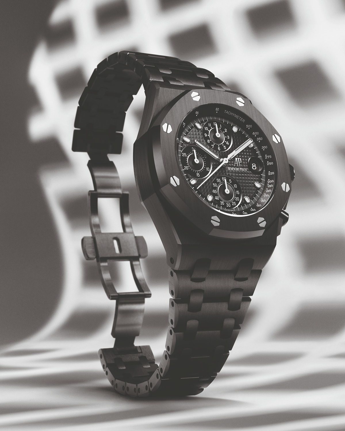 愛彼對每一個細節都非常講究,所有陶瓷零件都經過初步的亮面拋光和磨砂處理,並手工修飾所有的線條、棱角和斜面。錶殼上的八角錶圈由八顆不銹鋼螺絲固定,營造出獨特的輪廓和豐富的層次感。