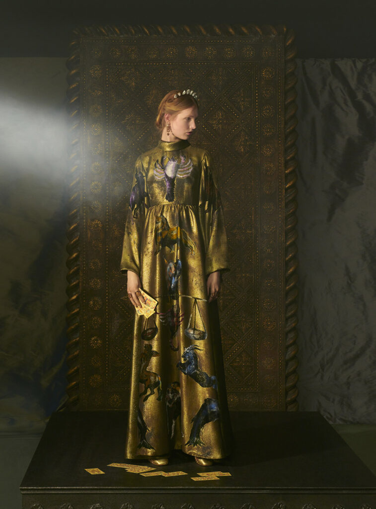 命運、自我、未知……這些關於人生的思考一定在某些時刻在你的腦海中出現過,尤其是當人們身處一個充滿變化的時代,而事實上克里斯汀•迪奧(Christian Dior)本人也曾熱衷於占卜藝術和命理。迪奧藝術總監Maria Grazia Chiuri於是以塔羅牌作爲打開時尚新世界的鑰匙,以塔羅牌中多元、神秘而有趣的人物作爲靈感設計出2021春夏高級訂製系列,再一次模糊了藝術和時尚的邊界。迪奧更是與義大利導演Matteo Garrone合作拍攝出製作精良的短片展示高訂魅力,每一幀畫面猶如文藝復興時期的油畫呈現光影交錯之美,平面塔羅牌上的人物被賦予了生命,鮮活地出現在我們眼前。華麗的金色貫穿整個系列,卡牌設計通過刺綉等方式化爲點綴細節浮現禮服之上,神秘的星座標識亦隱藏於華服細節中,而同時,又有類似絲絨綢緞吸烟裝,增添一抹不羈的率性。正如自我意識可以由不同的、互補的特質組成,一個人的外表也可以擁有無限種風格——2021春夏高訂系列大概是迪奧對於「我是誰」這個哲學問題的一種解讀。