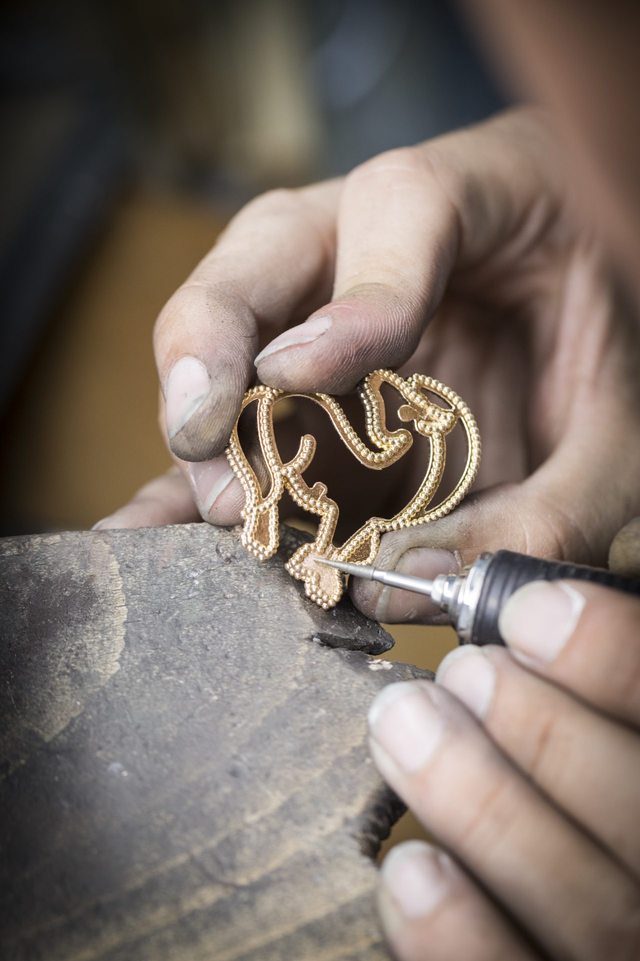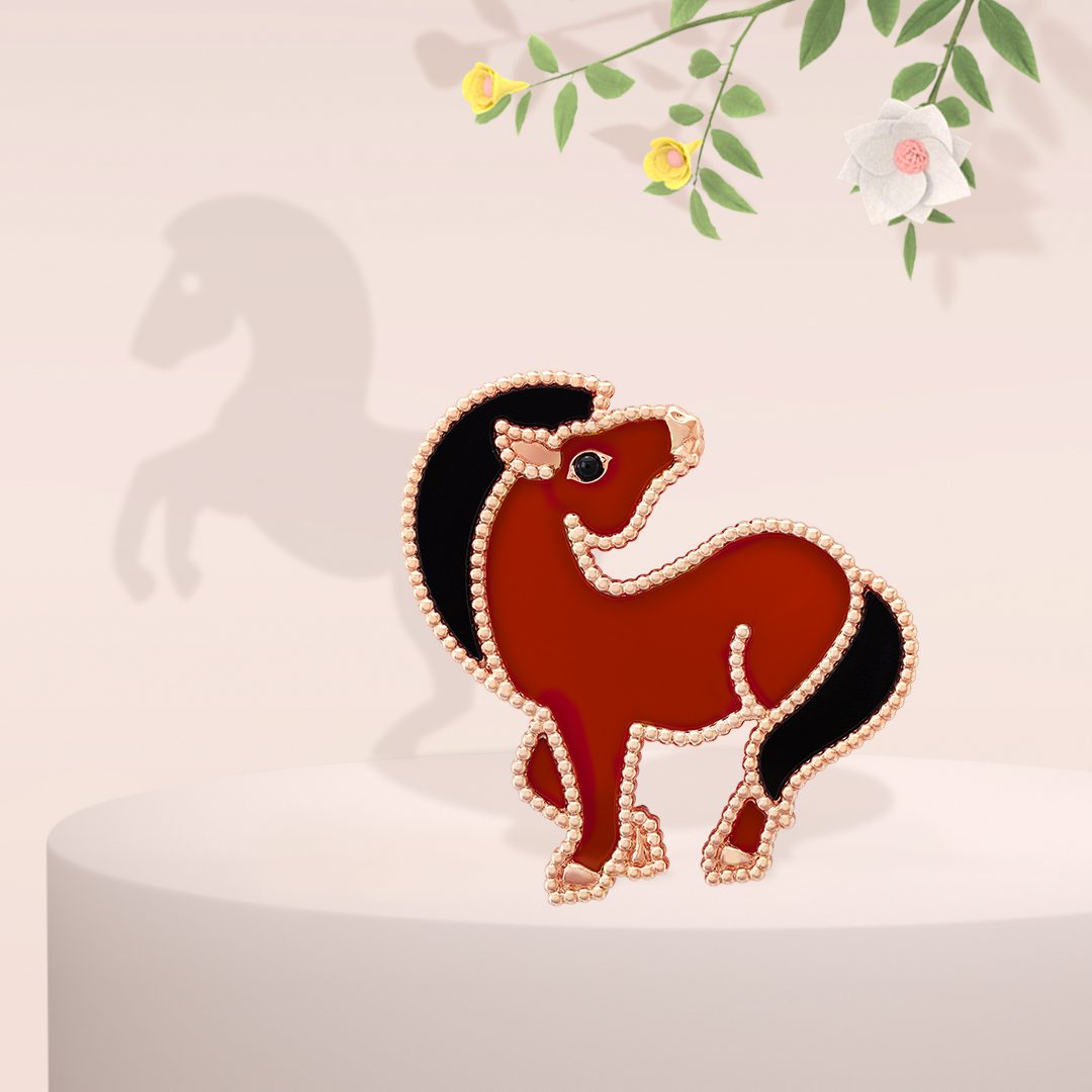 梵克雅寶自50年代起便擅長用珠寶描繪動物的姿態,而這件馬款胸針也延續品牌的詩意風格。整件作品以18K玫瑰金勾勒線條,散發柔和金光。紅玉髓帶來溫暖而飽滿的色澤,縞瑪瑙則增添沉穩深度。最具梵克雅寶辨識度的金珠滾邊環繞胸針四周,讓馬兒的身形更顯俐落,呈現出既精神又帶點親切的形象。