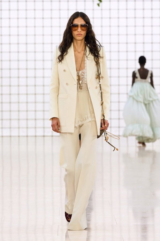 本季的設計不僅僅在剪裁與輪廓上有所突破,更在布料與色彩的選擇上展現了一場感官的盛宴。蔻依運用了大量富有自然肌理的布料,經過日曬褪色、水洗與磨損處理後,呈現出彷彿經歷歲月洗禮的珍貴質感。棉質與亞麻的組合,使服裝在輕盈與結構之間達到和諧,營造出一種既率性又優雅的氛圍。此外,凸紋蕾絲與絲綢的運用,使服裝在行走間展現靈動的飄逸感,猶如微風輕撫肌膚,帶來夏日獨有的舒適與詩意。
