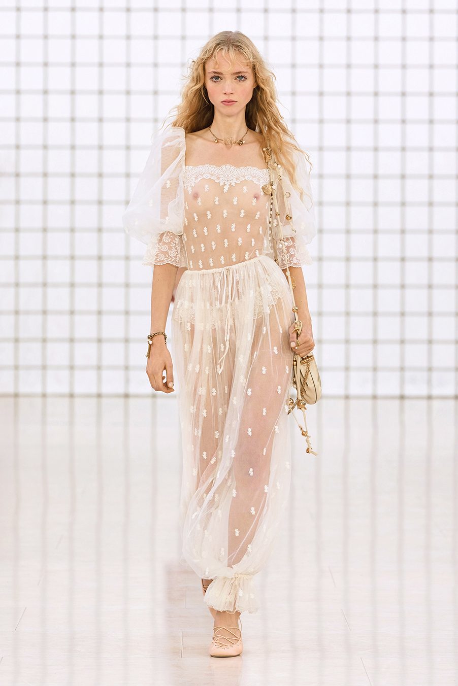 本季的設計不僅僅在剪裁與輪廓上有所突破,更在布料與色彩的選擇上展現了一場感官的盛宴。蔻依運用了大量富有自然肌理的布料,經過日曬褪色、水洗與磨損處理後,呈現出彷彿經歷歲月洗禮的珍貴質感。棉質與亞麻的組合,使服裝在輕盈與結構之間達到和諧,營造出一種既率性又優雅的氛圍。此外,凸紋蕾絲與絲綢的運用,使服裝在行走間展現靈動的飄逸感,猶如微風輕撫肌膚,帶來夏日獨有的舒適與詩意。
