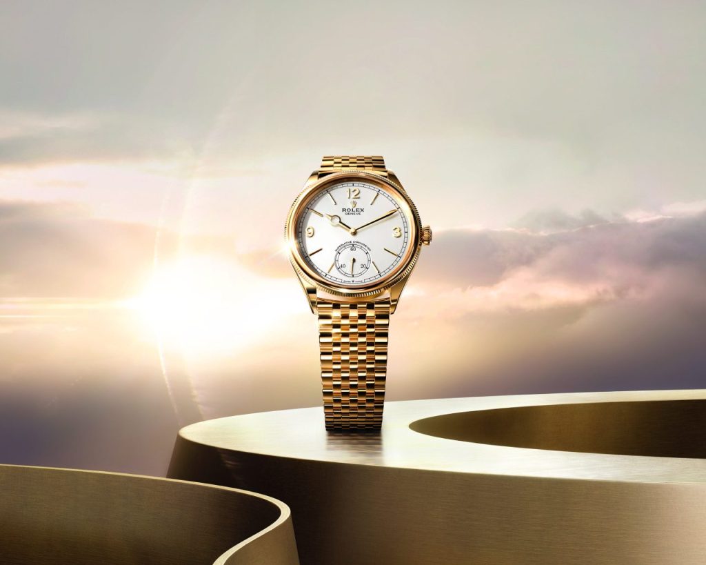 勞力士再度以腕錶語彙書寫優雅新章,以39毫米18K黃金打造的錶殼,搭配全新七臻型(Settimo)金屬錶帶,帶給這款女裝腕錶展現難得一見的柔韌光澤與輕盈觸感。錶帶結構源自古董珠寶錶帶的靈感,七排鏈節宛若細膩的雕塑,在手腕間自然流動,隱蔽式皇冠帶扣更讓整體輪廓一氣呵成。醇白色錶面設計簡潔大方,3、9、12點鐘位置採用立體阿拉伯數字,6點鐘則設有小秒針盤,細節間不失經典氣韻。寶璣針造型時針與雙刃劍分針交相呼應,低調中帶有一絲個性,彷彿為佩戴者訴說時間的韻律。