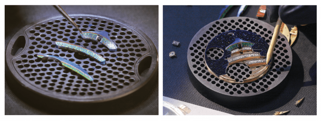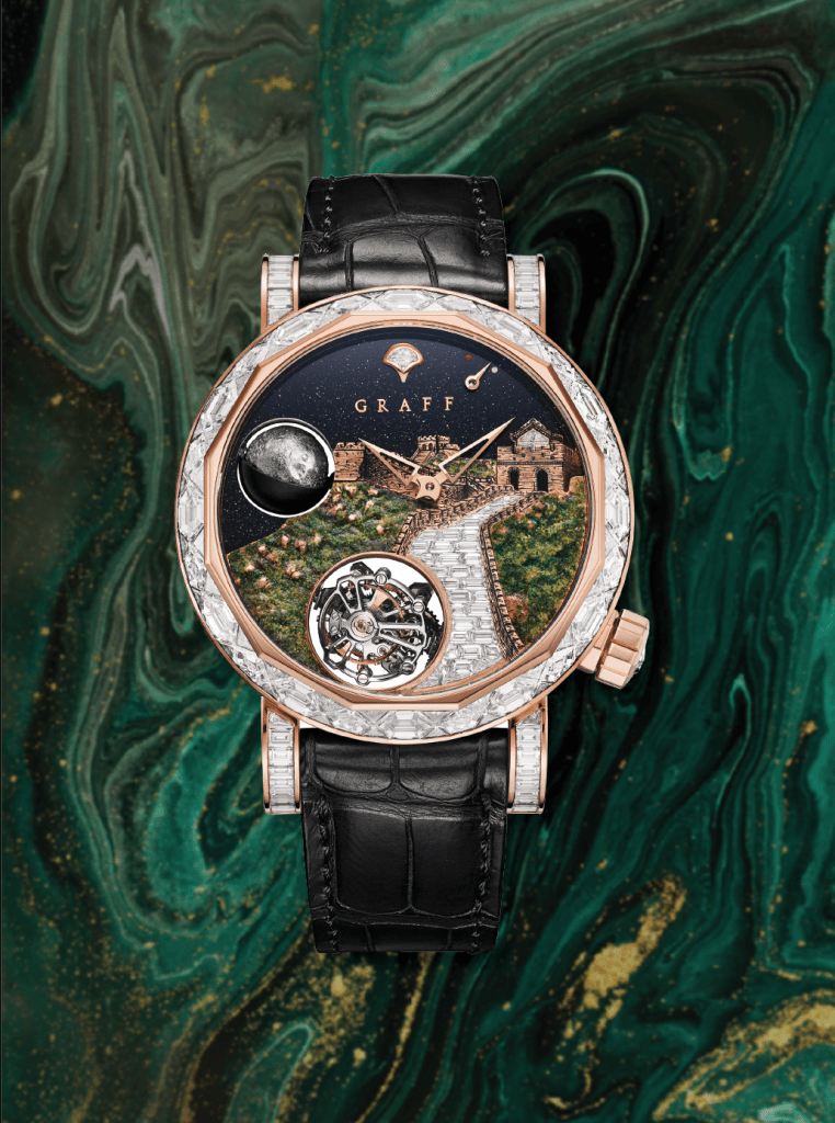 格拉夫工藝大師結合多種罕見的手工技藝,包括手工雕刻、微型彩繪、寶石鑲嵌,令中國兩大歷史名勝逼真再現於腕錶之上。每款立體錶盤耗時一百小時製作,精美細膩,堪比藝術珍品,而其中的高級工藝細節,需輔以放大鏡方能儘賞。錶盤上的立體月相顯示由品牌工藝大師手工細心雕琢,呈現最為貼近現實的隕石坑圖案,球形罩亦可轉動,以顯示不同時期的月相變化。