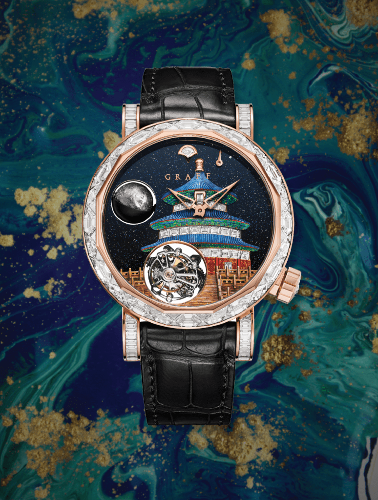 GyroGraff China系列另一款GyroGraff天壇(Temple of Heaven)腕錶,以天壇祈年殿為錶盤主題。天壇位於北京,初建於明朝(1420年),是明清兩代帝王祭天、祈穀及祈雨的場所,也是中國現存最大的祭祀建築群。它於1998年被聯合國教科文組織(UNESCO)列為世界遺產。GyroGraff天壇腕錶錶盤上的祈年殿圖像也由四層裝飾組成:底層同樣為砂金石製作的夜空背景;第二層是祈年殿建築物主體,在立體造型的金制部件上飾以微型彩繪,其中屋頂、鑽石外框為純黃金,建築底部採用黃金描繪細節,三級屋簷下均鑲嵌長階梯形切割鑽石;第三層與第四層是飾以微型彩繪的雕刻階梯和磚牆。