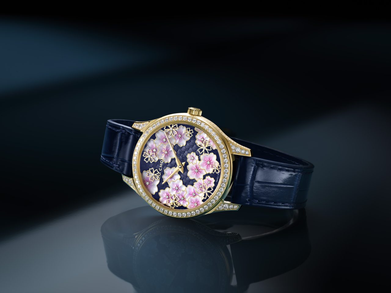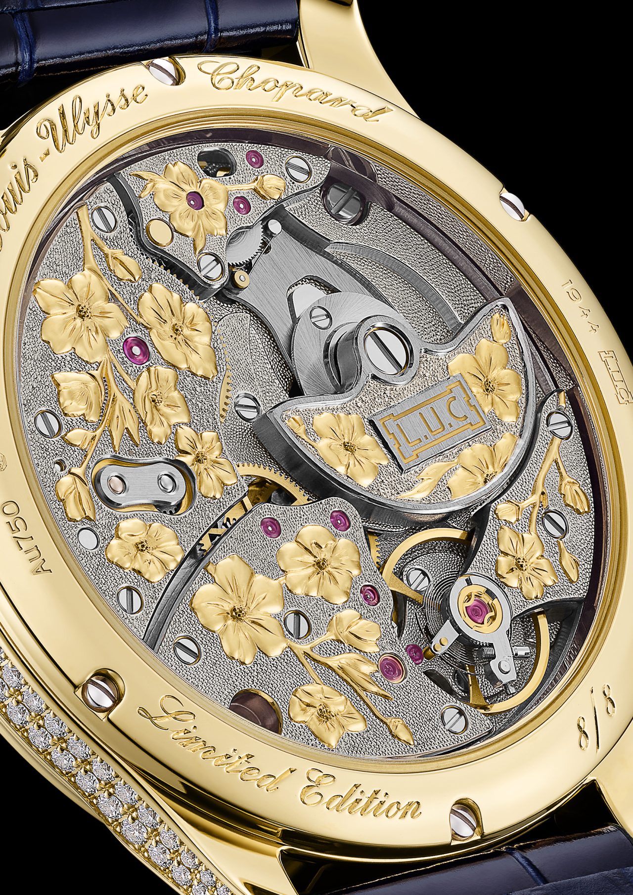 L.U.C XP Sakura by Night腕錶的創作靈感源自日本文化中稍縱即逝的夜櫻(Yozakura,即夜間賞櫻)。腕錶錶盤結合了手工機刻雕花、半透明亮漆、珍珠母貝雕刻與鏤空金雕等多種藝術工藝,並點綴璀璨鑽石,營造出懾人的視覺深度。錶背搭載的超薄機芯,同樣經過工坊匠師的精心潤飾。機芯的白金夾板橋上,工匠採用了傳統的弗勒里耶雕刻工藝(Fleurisanne engraving),透過複雜的工序將櫻花圖案以浮雕效果呈現,並進行雙色處理。