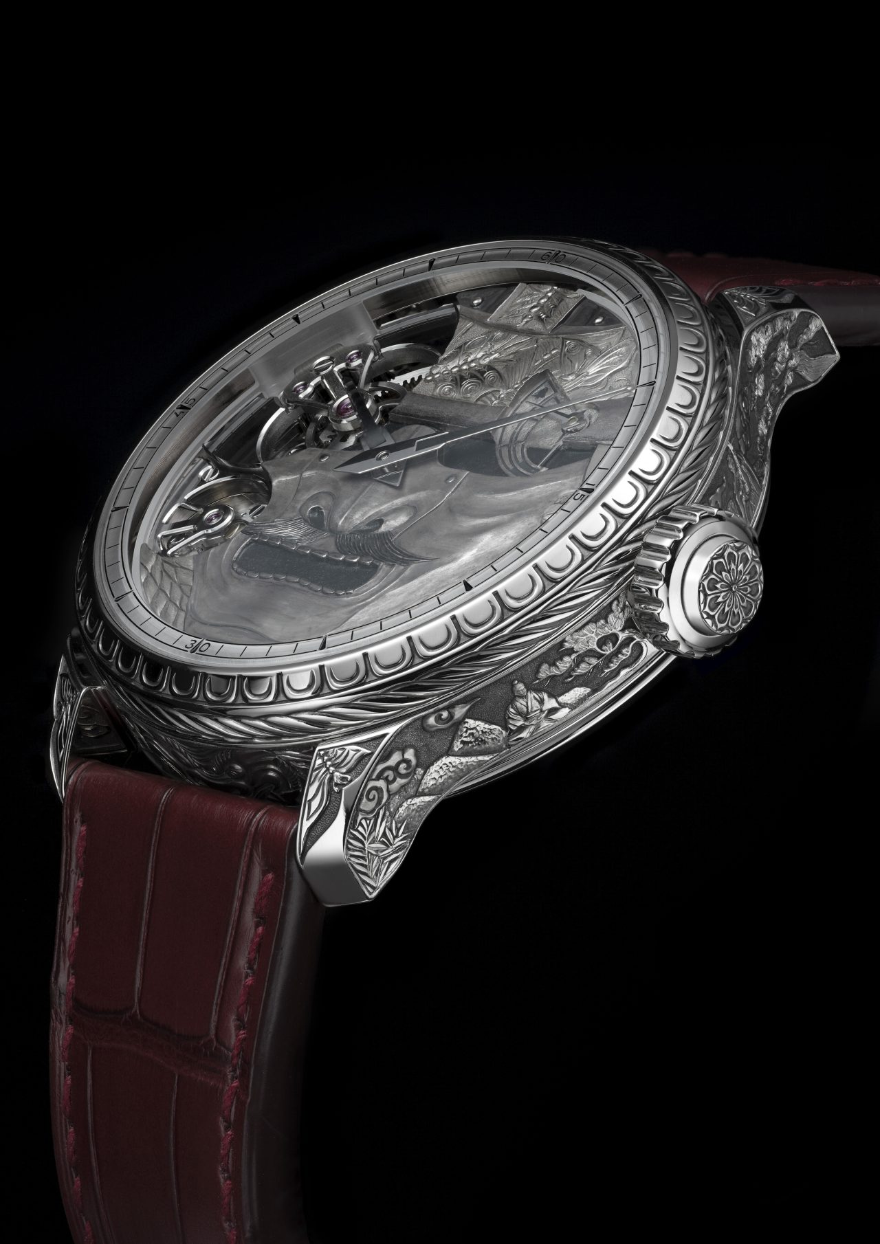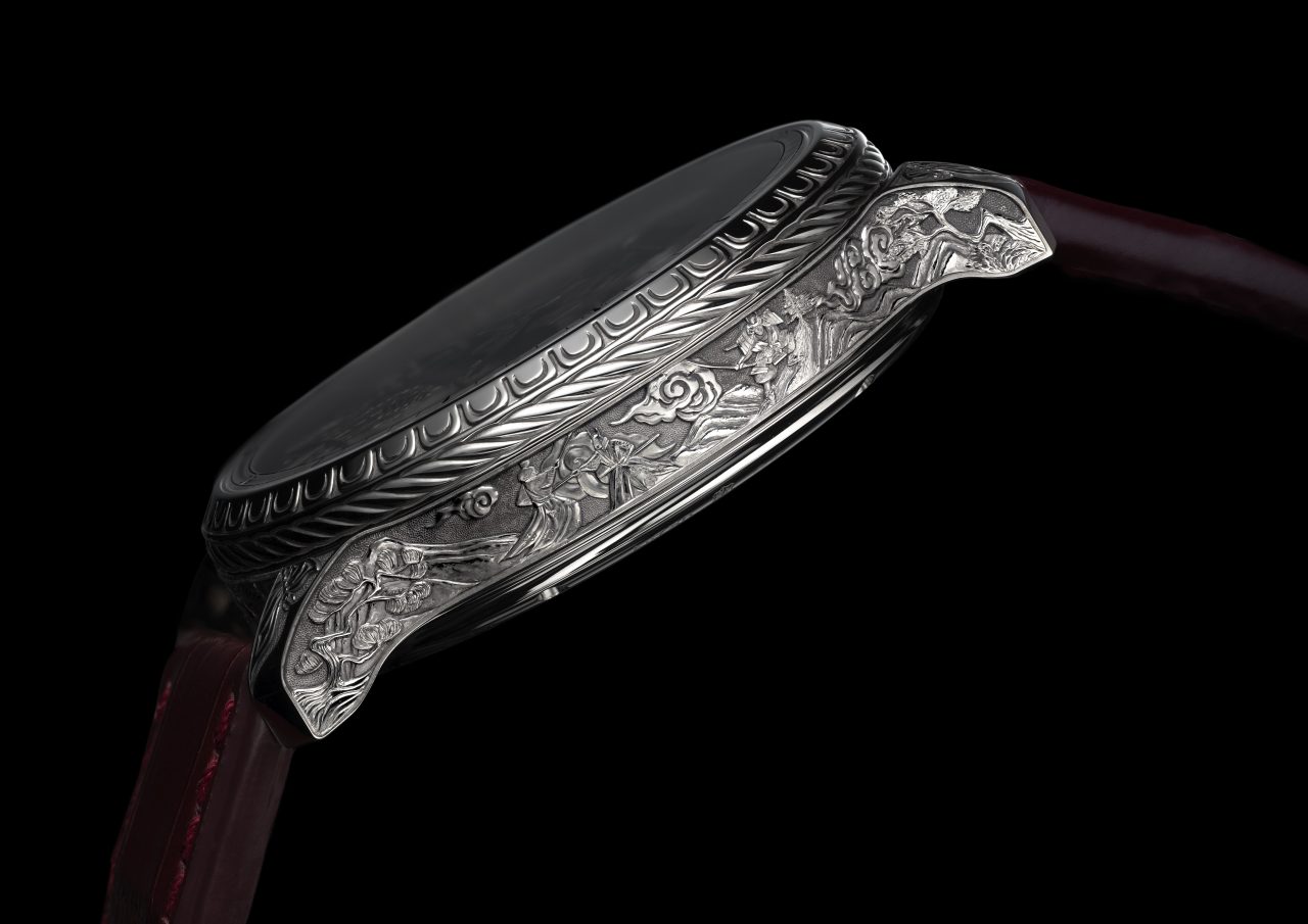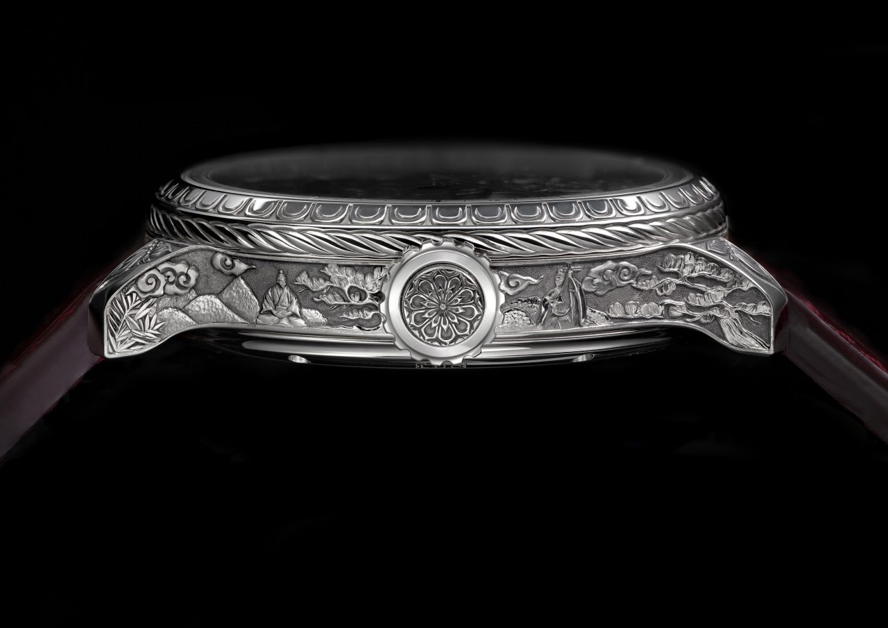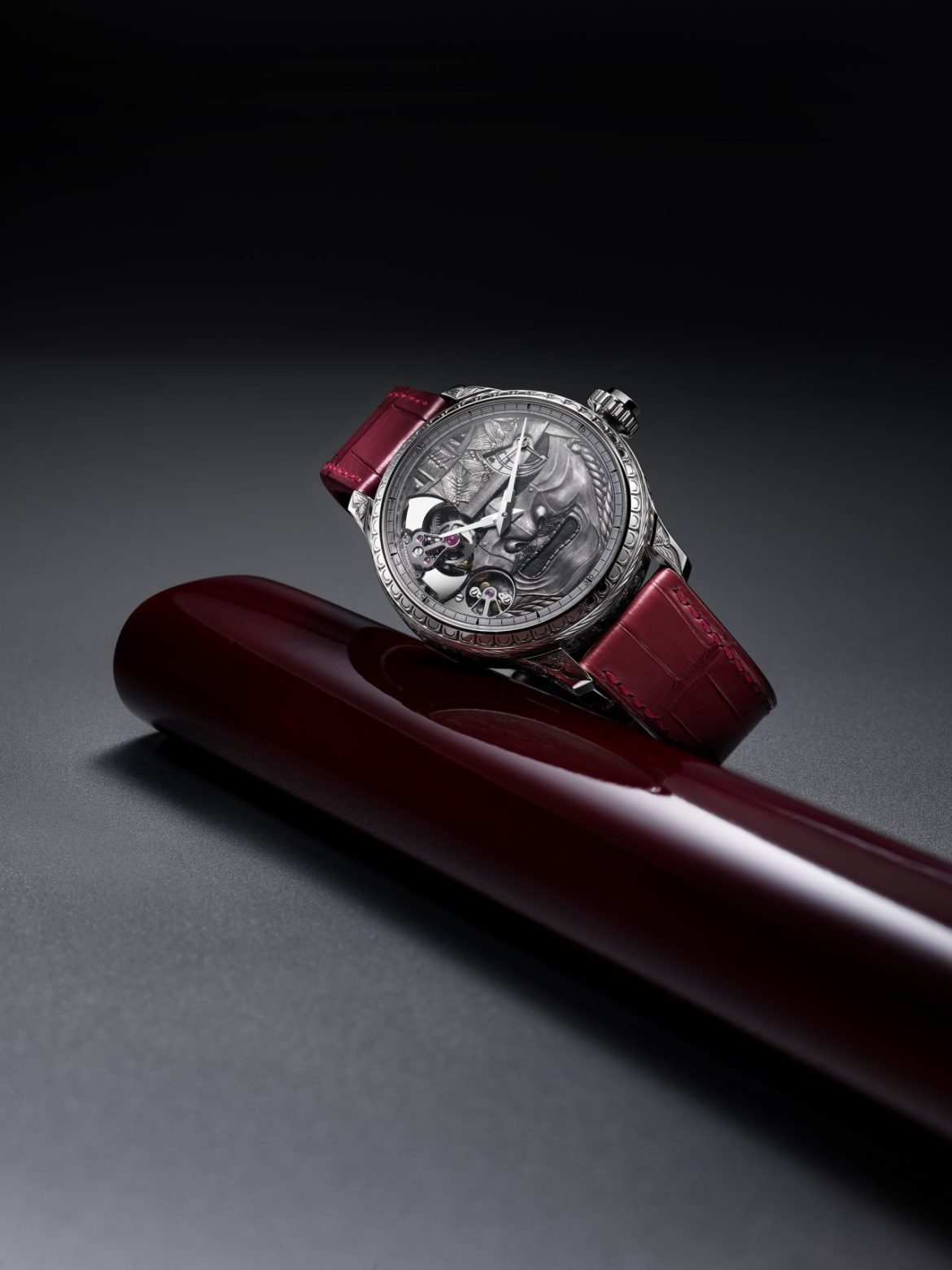 L.U.C Full Strike 「Spirit of the Warrior」武士精神腕錶,結合了三問報時複雜功能與日本傳統武士道精神。腕錶搭載蕭邦標誌性的三問報時機芯,機芯本身亦經過手工悉心雕飾。其最引人注目的特點,是採用藍寶石水晶音簧,能鳴奏出如水晶般清澈的樂音。錶殼以18K白金打造,錶身細節處以精緻的手工鐫刻,展現出武士世界的傳奇故事與道德準則。此外,蕭邦更為其特別打造了專屬錶盒,內建一座雲杉木共鳴箱,專門放大三問報時的聲學效果,完美呈現其純淨音色與豐富音調,實屬集藝術、技術與精神於一身的傑作。